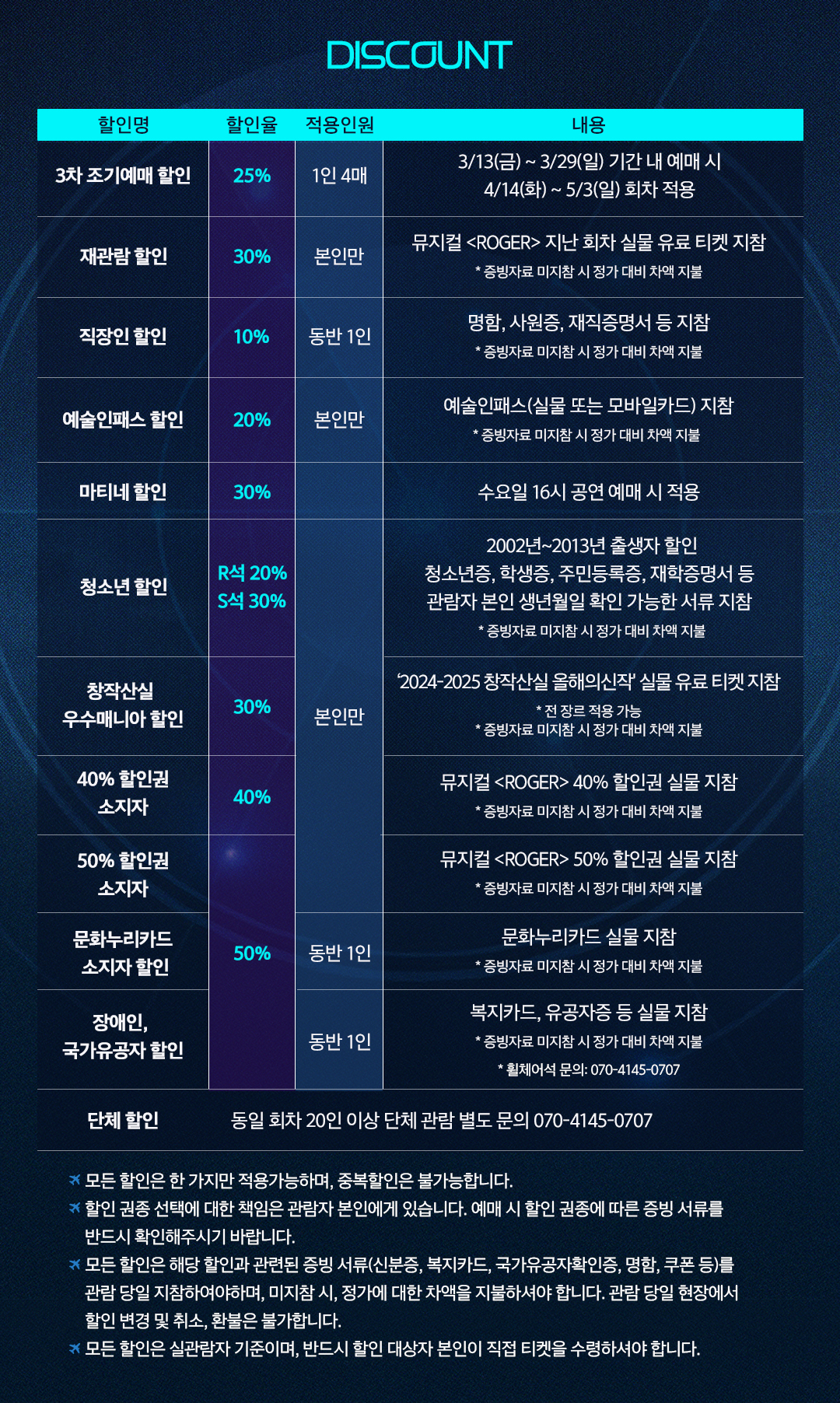 - 예매 후 7일 이내 취소시 티켓 금액 전액이 환불됩니다.(예매 수수료 제외)