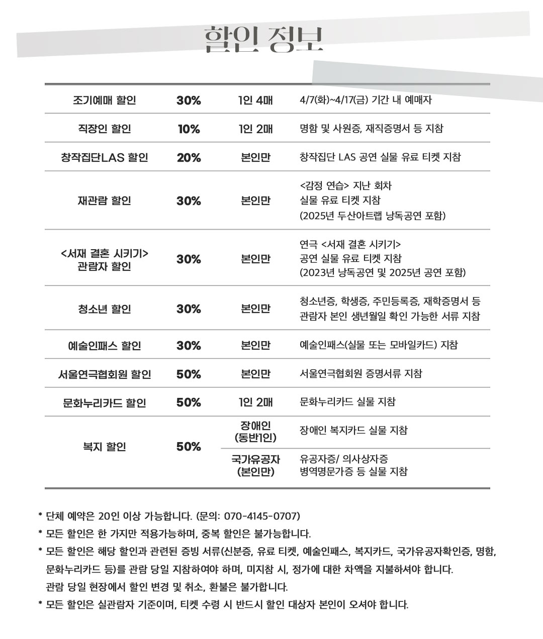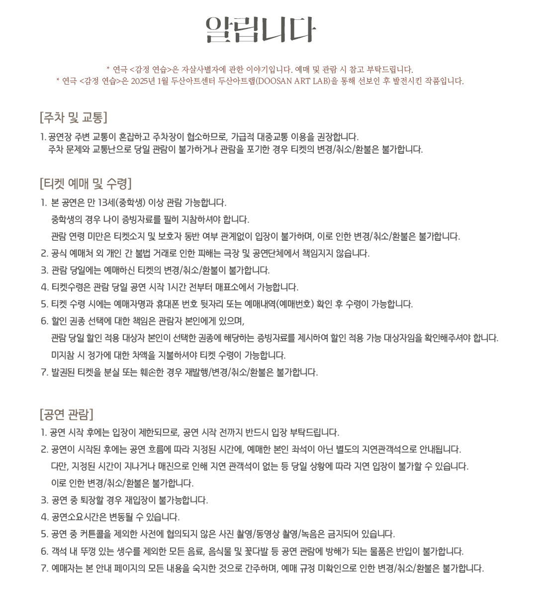 - 관람일 2일전 ~ 취소기한까지: 티켓금액의 30%