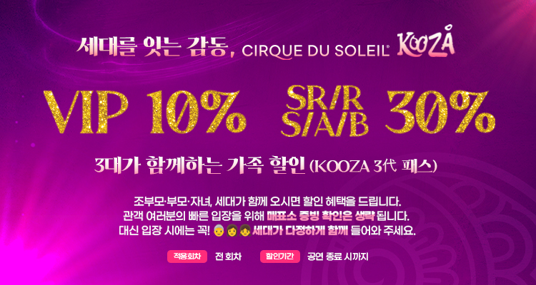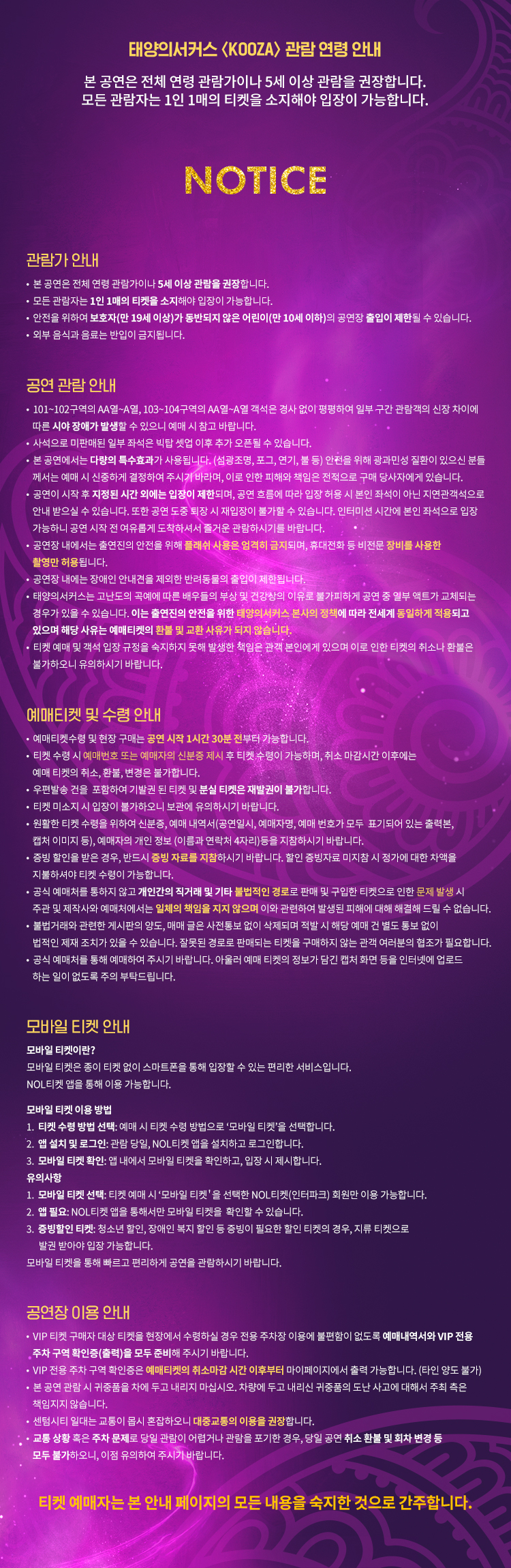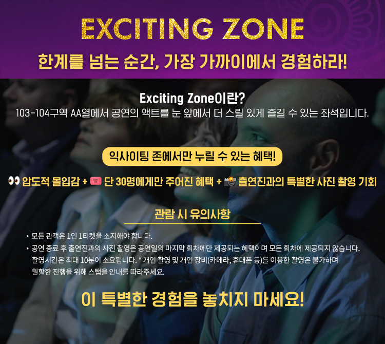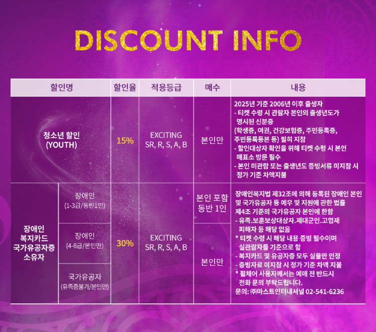 ※ 일부 회차 및 좌석은 전관 행사와 단체 판매로 인해 사전 마감될 수 있습니다.