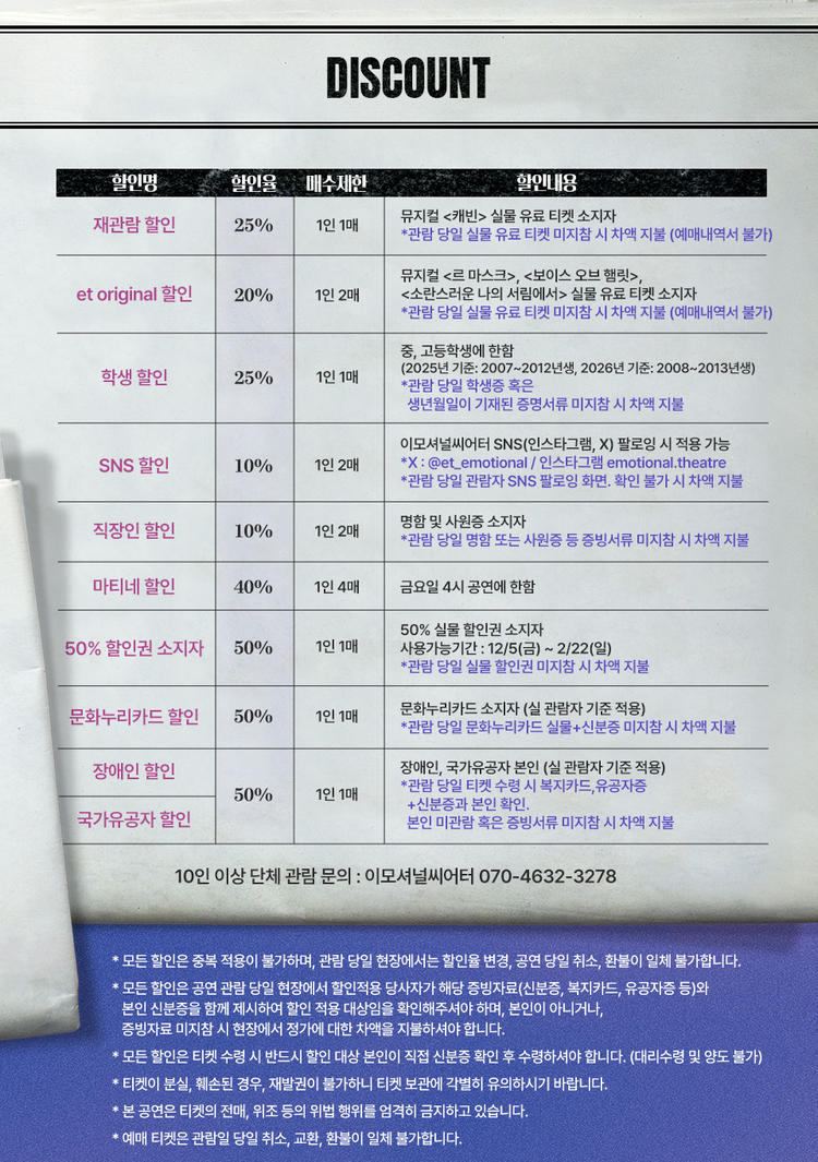 - 특정 기간, 특정 공연일에만 판매하는 가격이 있으니 예매 전 [가격 전체 보기]를 눌러 확인해 주세요.