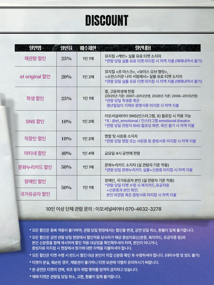 - 관람일 2일전 ~ 취소기한까지: 티켓금액의 30%