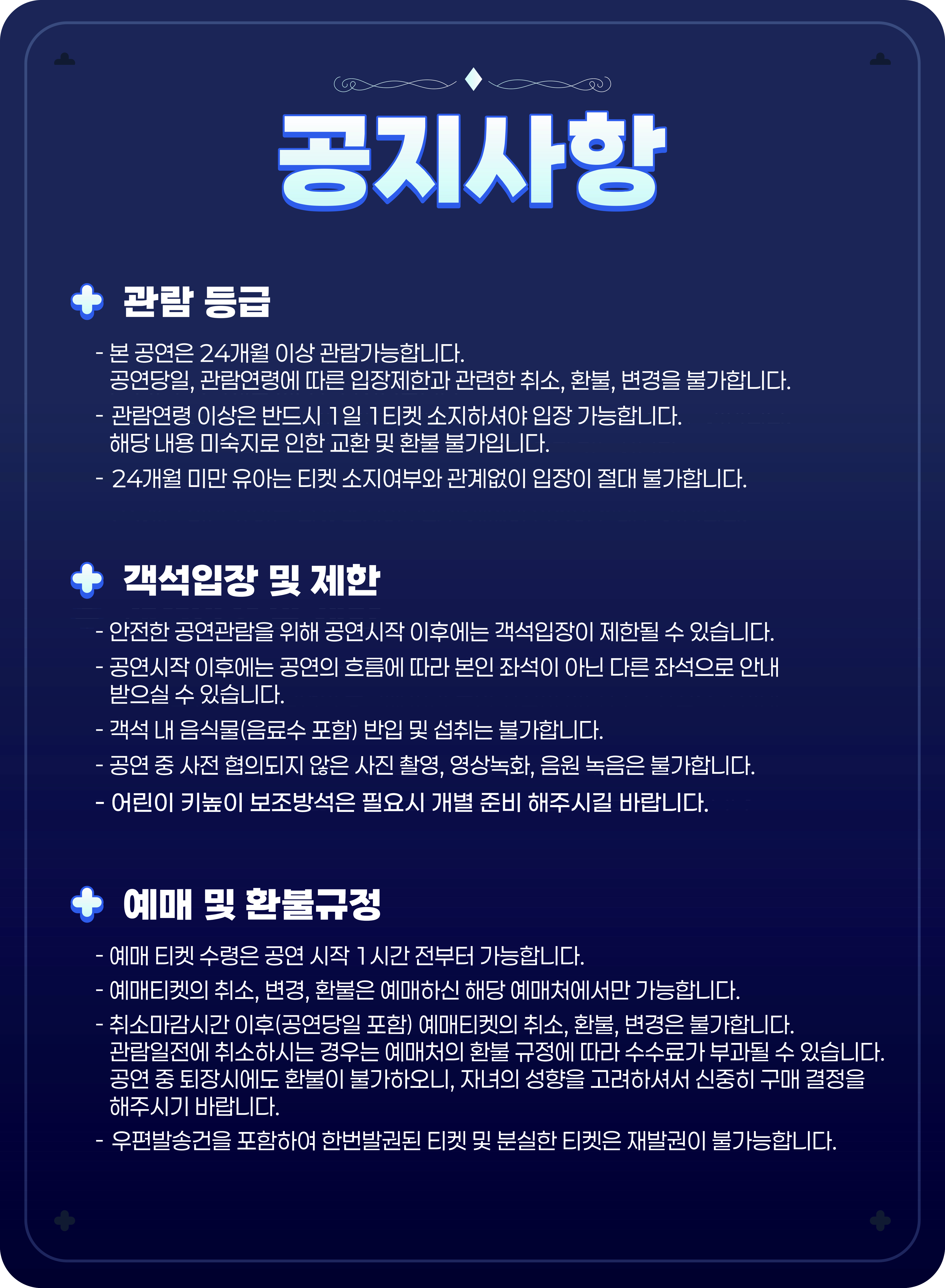 - 관람일 2일전 ~ 취소기한까지: 티켓금액의 30%