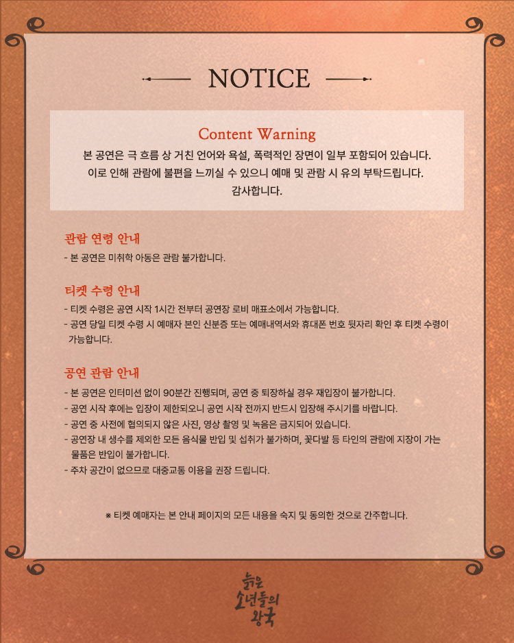 - 관람일 2일전 ~ 취소기한까지: 티켓금액의 30%
