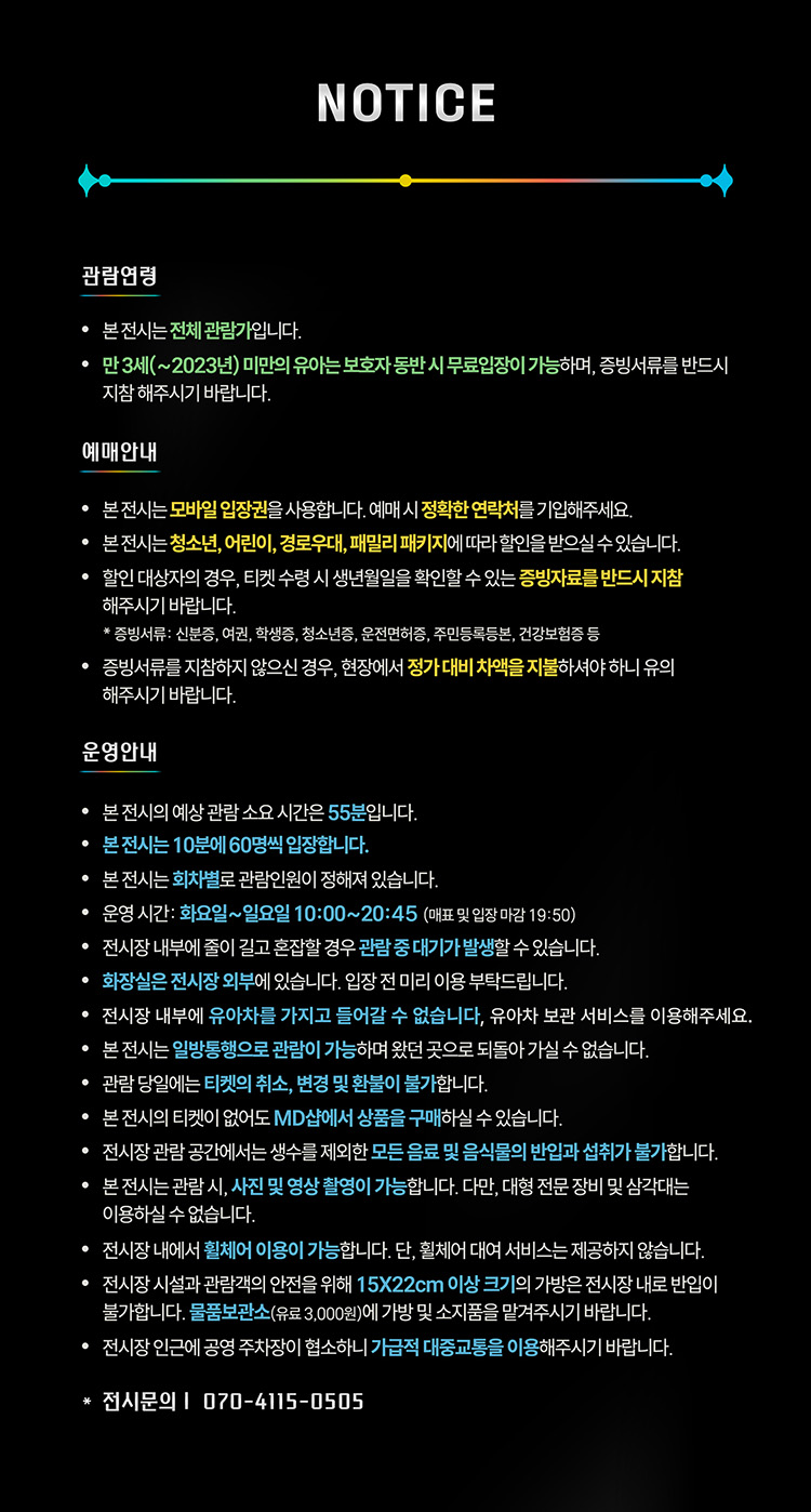 관람시간 10:00 ~ 20:00 (입장 마감 19:00) 매주 월요일은 휴관일입니다.