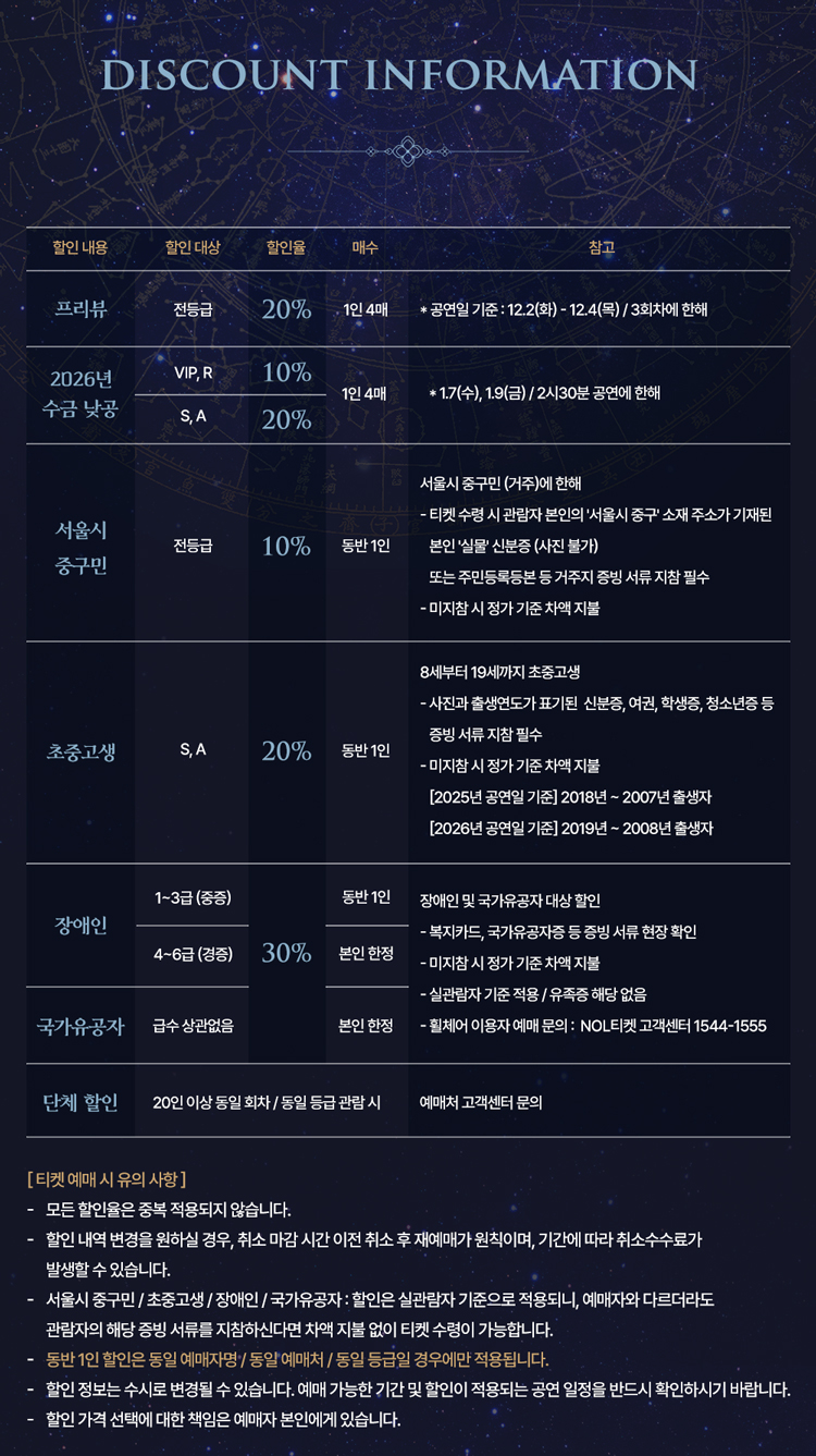 - 특정 기간, 특정 공연일에만 판매하는 가격이 있으니 예매 전 [가격 전체 보기]를 눌러 확인해 주세요.