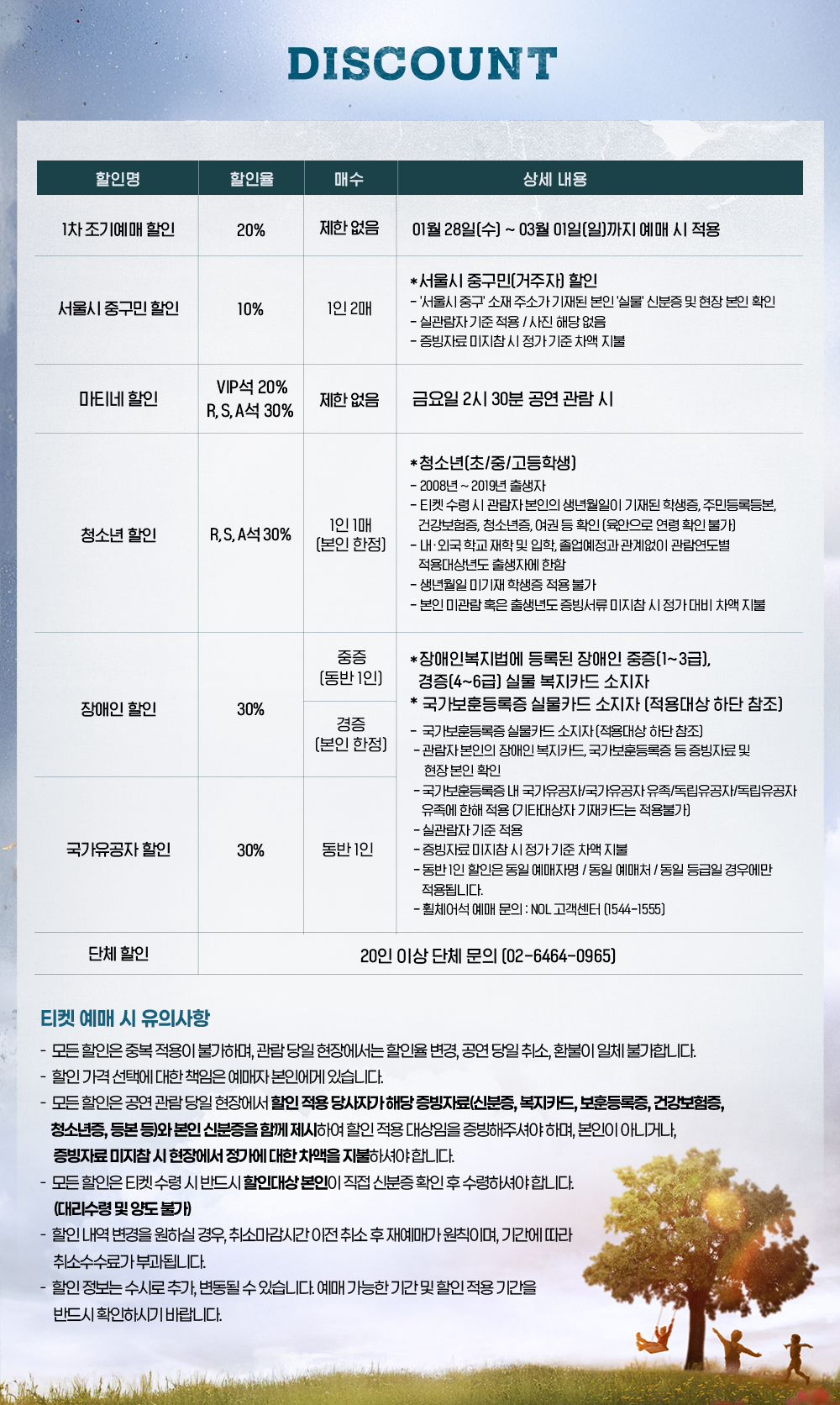 - 특정 기간, 특정 공연일에만 판매하는 가격이 있으니 예매 전 [가격 전체 보기]를 눌러 확인해 주세요.