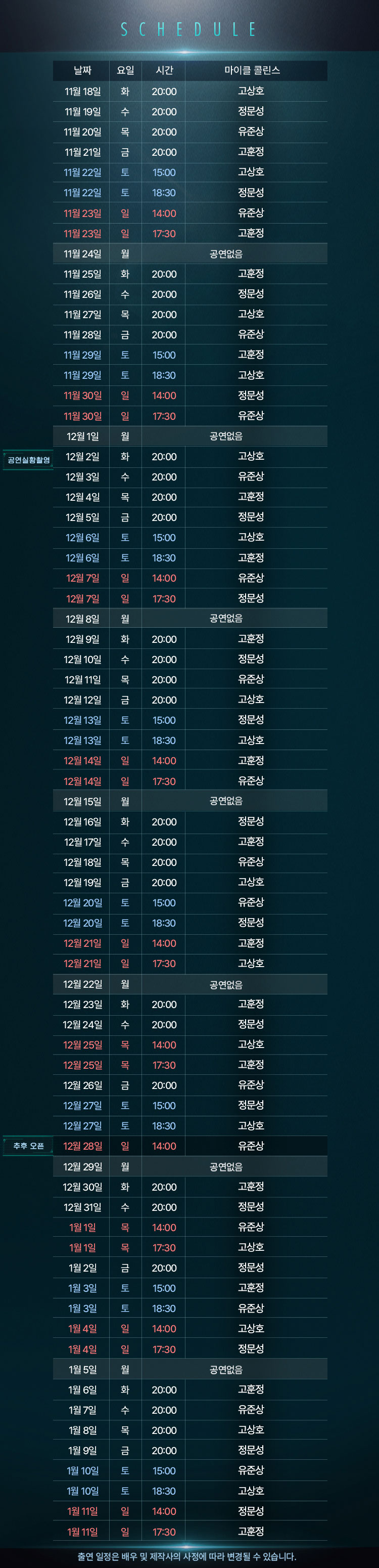 화 - 금 20시 / 토 15시, 18시 30분 / 일, 공휴일 14시, 17시 30분 (윌 공연 없음)