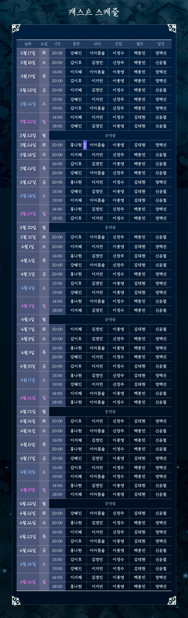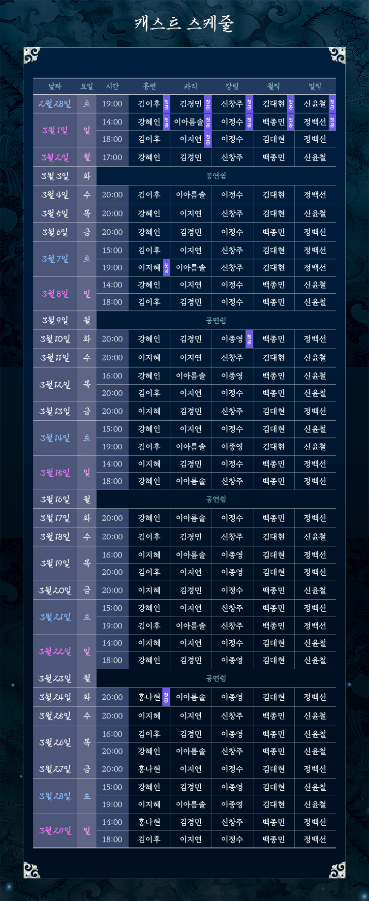 화, 수, 금 20시 / 목 16시, 20시 / 토 15시, 19시 / 일, 공휴일 14시, 18시 (월 공연 없음)