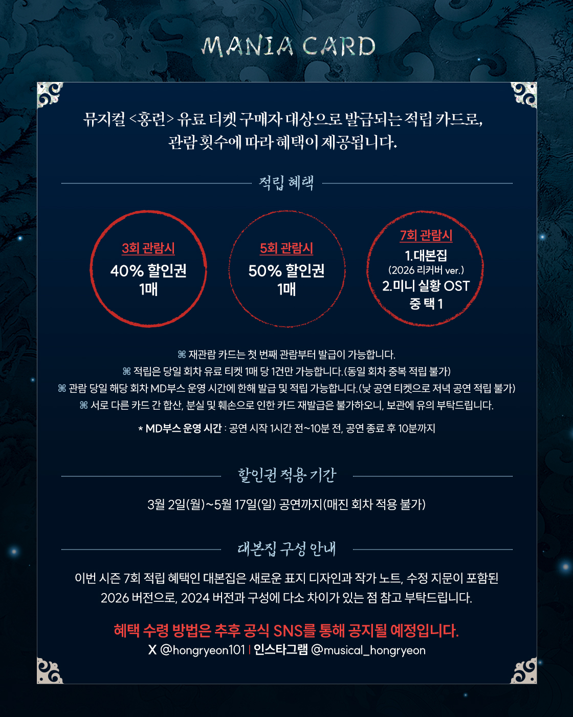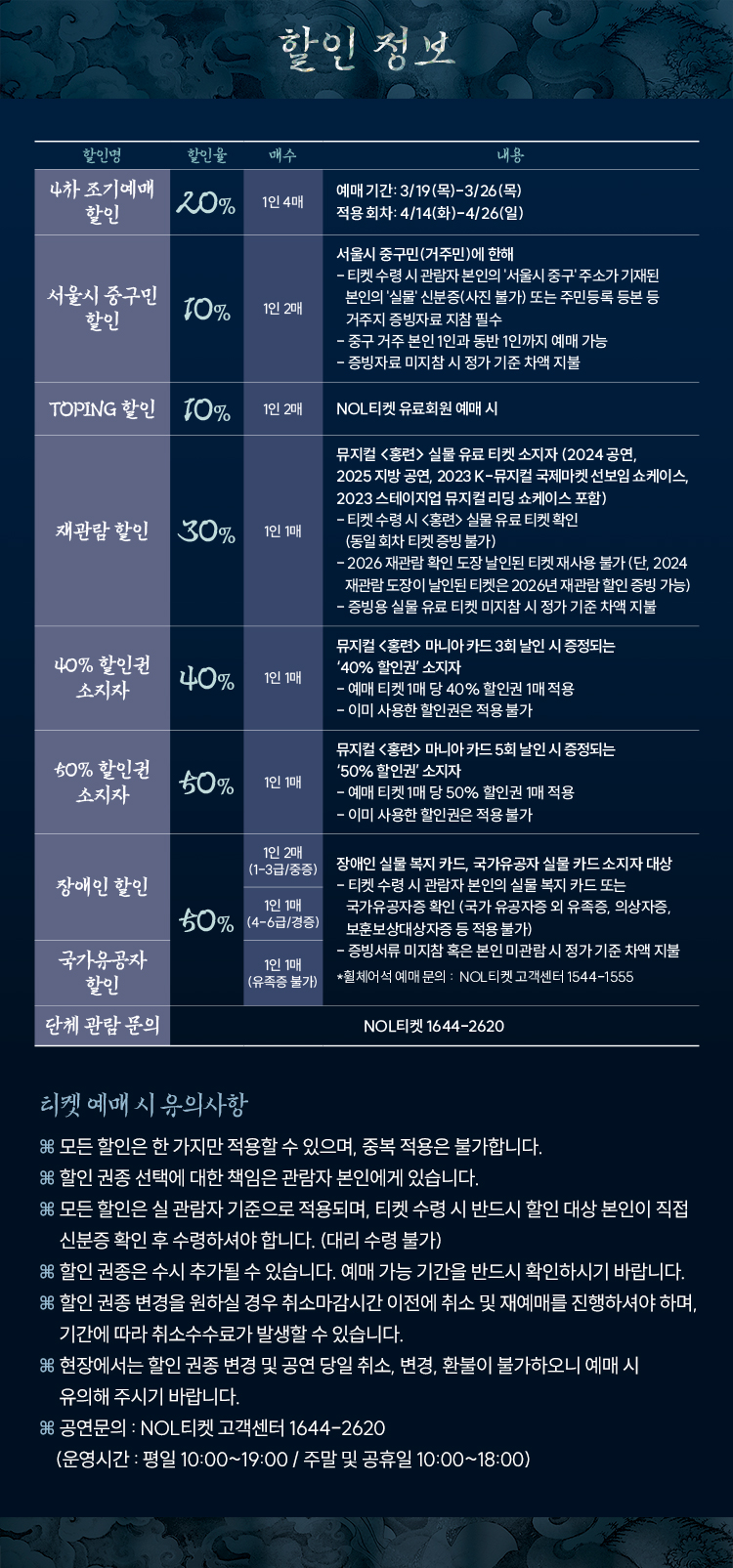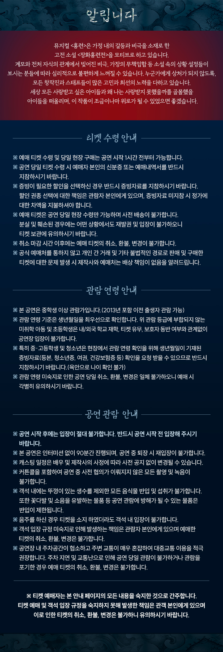 - 관람일 2일전 ~ 취소기한까지: 티켓금액의 30%