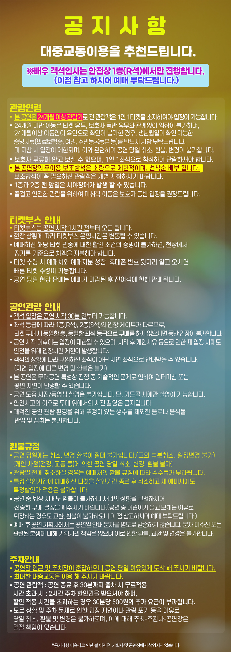 - 예매 후 7일 이내 취소시 티켓 금액 전액이 환불됩니다.(예매 수수료 제외)