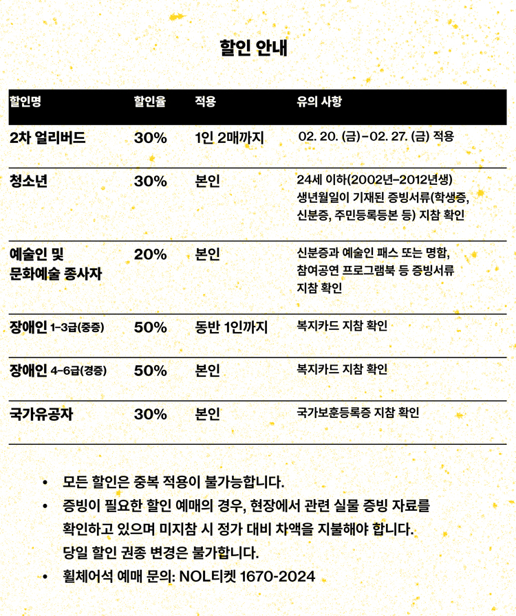 - 특정 기간, 특정 공연일에만 판매하는 가격이 있으니 예매 전 [가격 전체 보기]를 눌러 확인해 주세요.