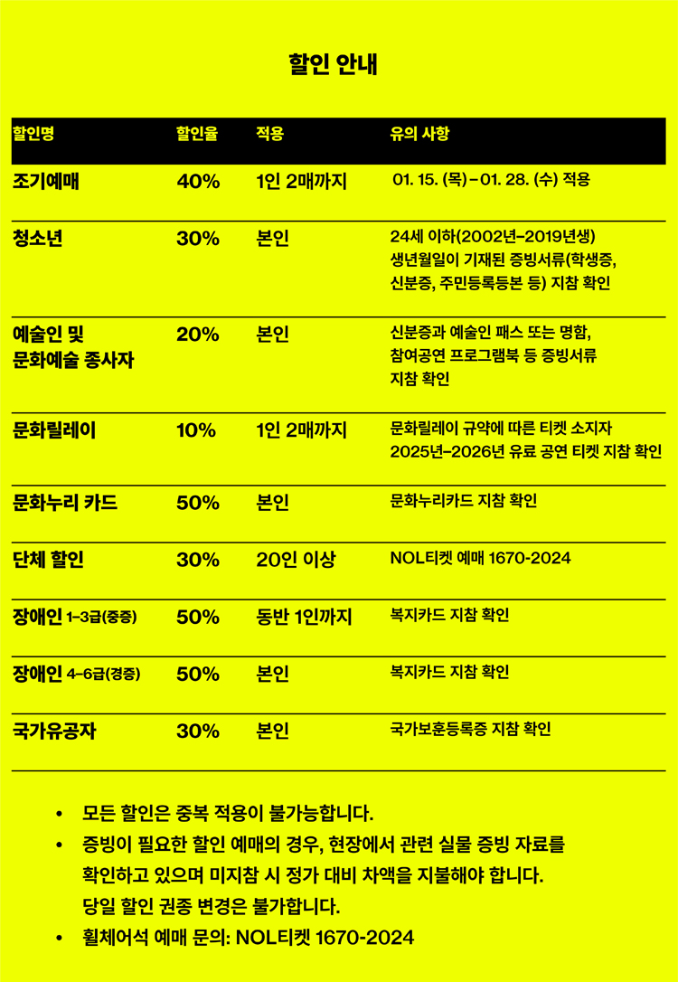 - 특정 기간, 특정 공연일에만 판매하는 가격이 있으니 예매 전 [가격 전체 보기]를 눌러 확인해 주세요.