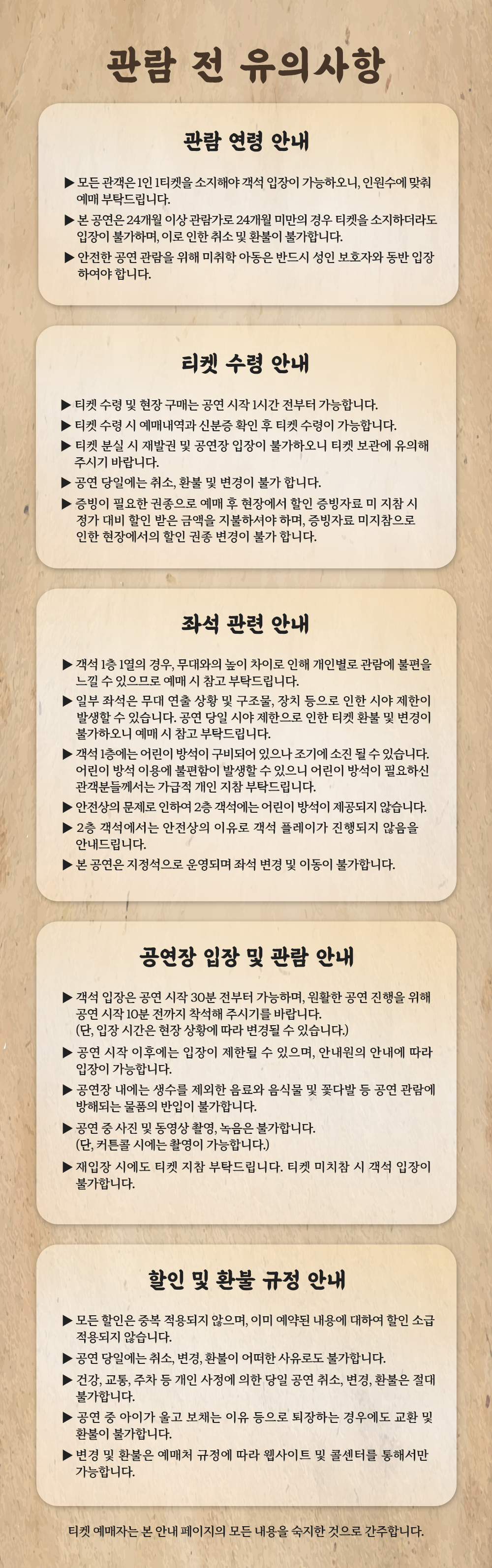 - 관람일 2일전 ~ 취소기한까지: 티켓금액의 30%