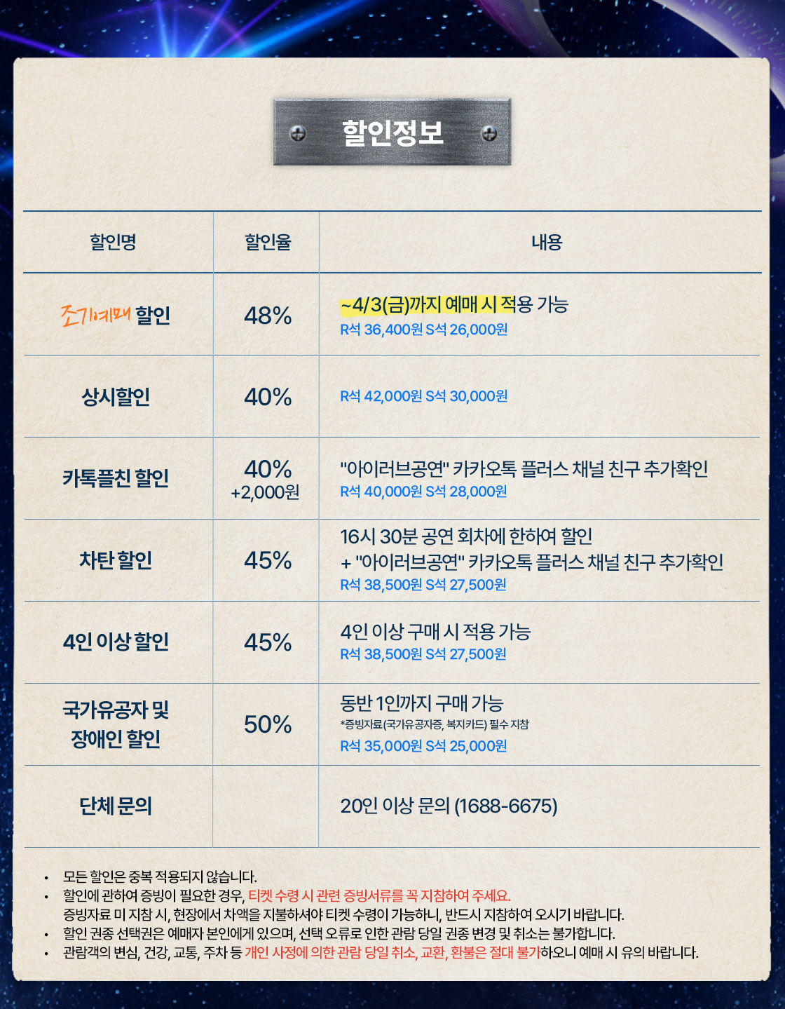 - 특정 기간, 특정 공연일에만 판매하는 가격이 있으니 예매 전 [가격 전체 보기]를 눌러 확인해 주세요.