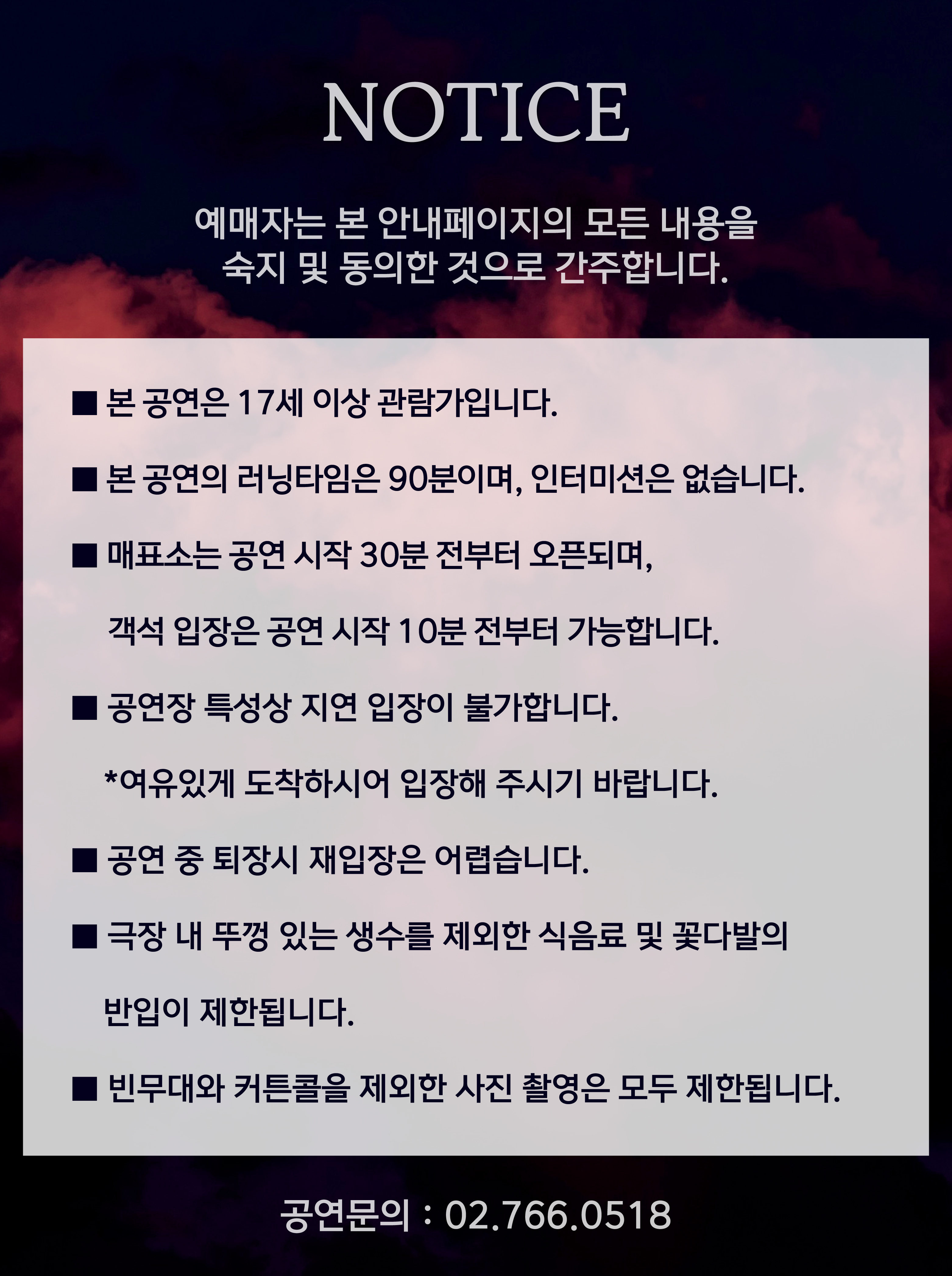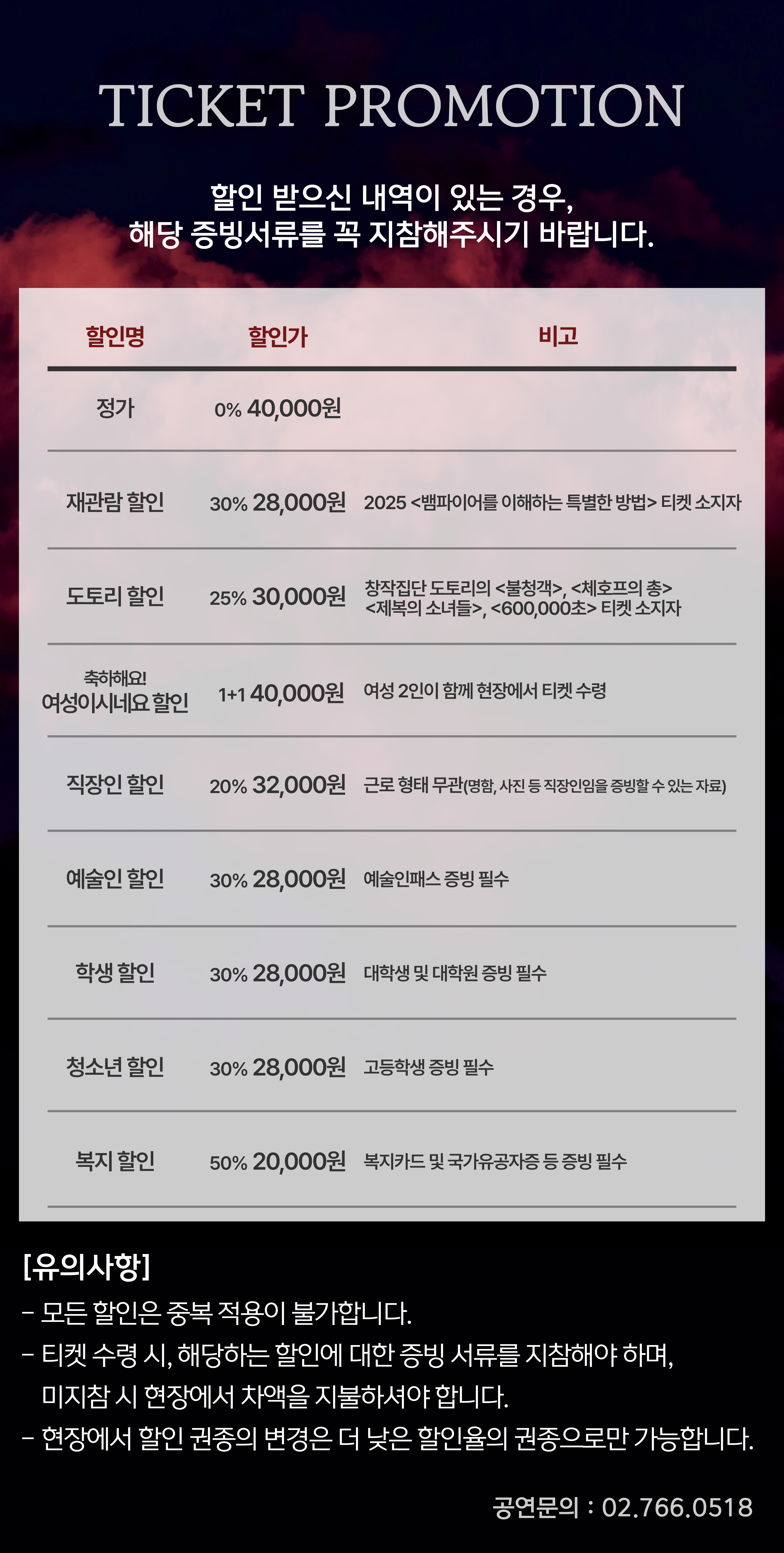 - 관람일 2일전 ~ 취소기한까지: 티켓금액의 30%