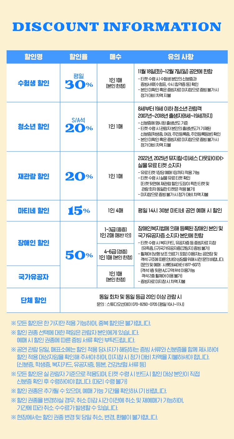 예매 티켓 수령/할인/증빙(차액), 관람 연령, 공연 장소, 교통/주차, 좌석에 따른 안내 미숙지는 관람자 본인에게 책임이 있으며, 해당 사유로 인한 예매 티켓의 취소/환불/변경은 불가합니다.
