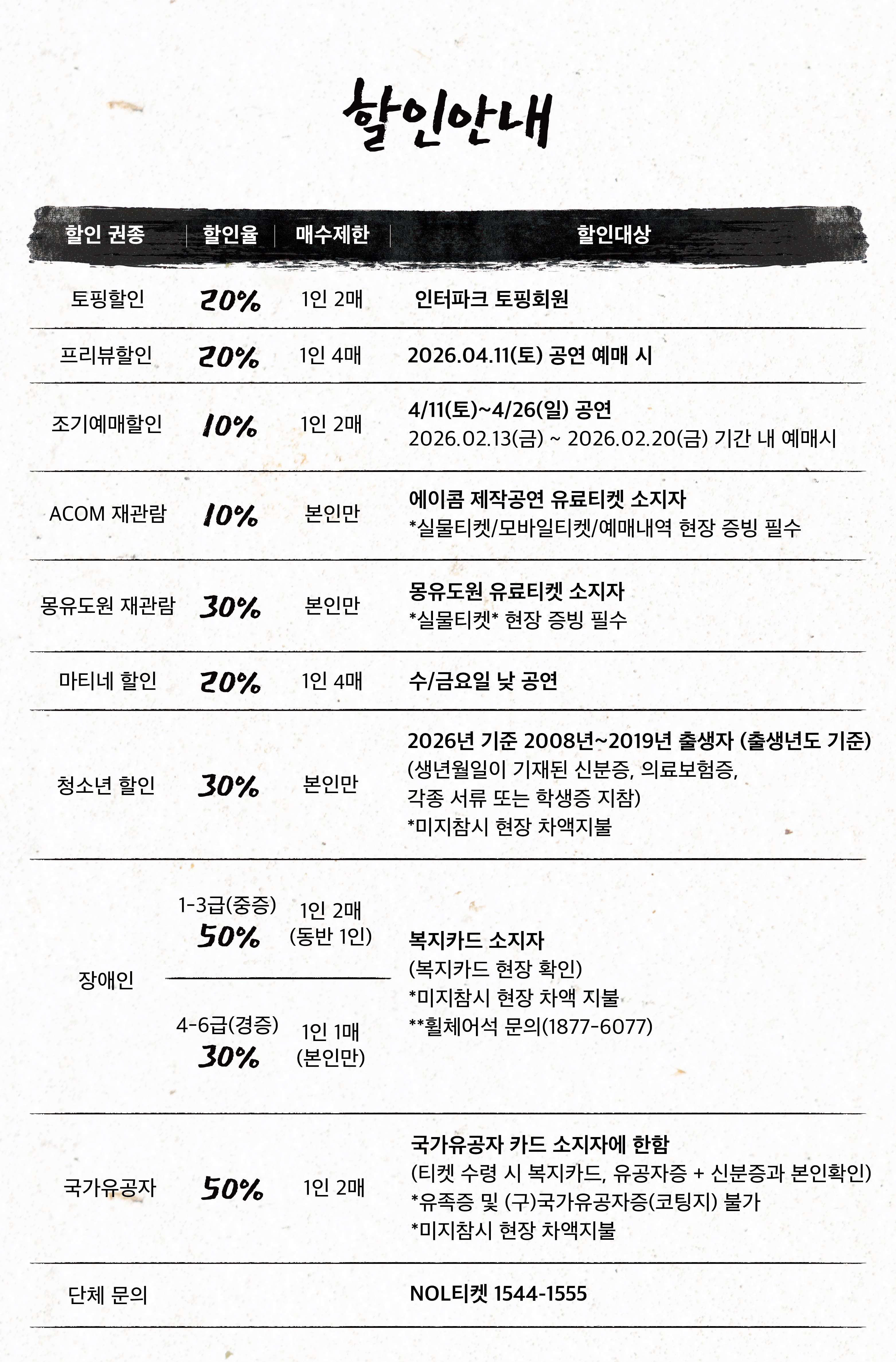 - 관람일 2일전 ~ 취소기한까지: 티켓금액의 30%