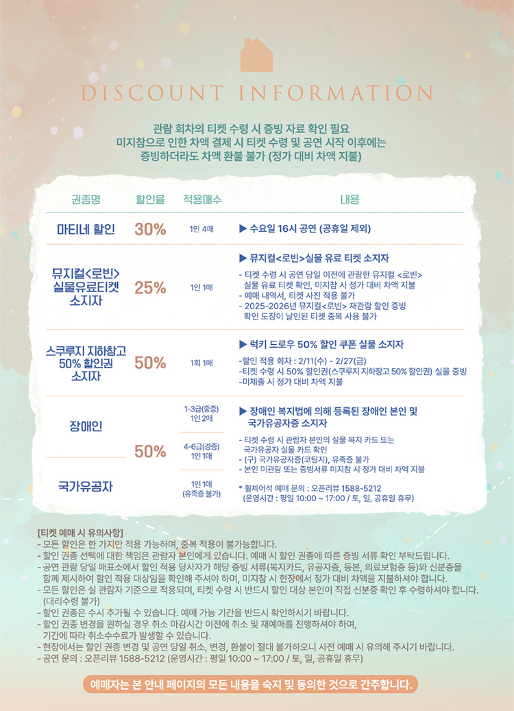 - 관람일 2일전 ~ 취소기한까지: 티켓금액의 30%