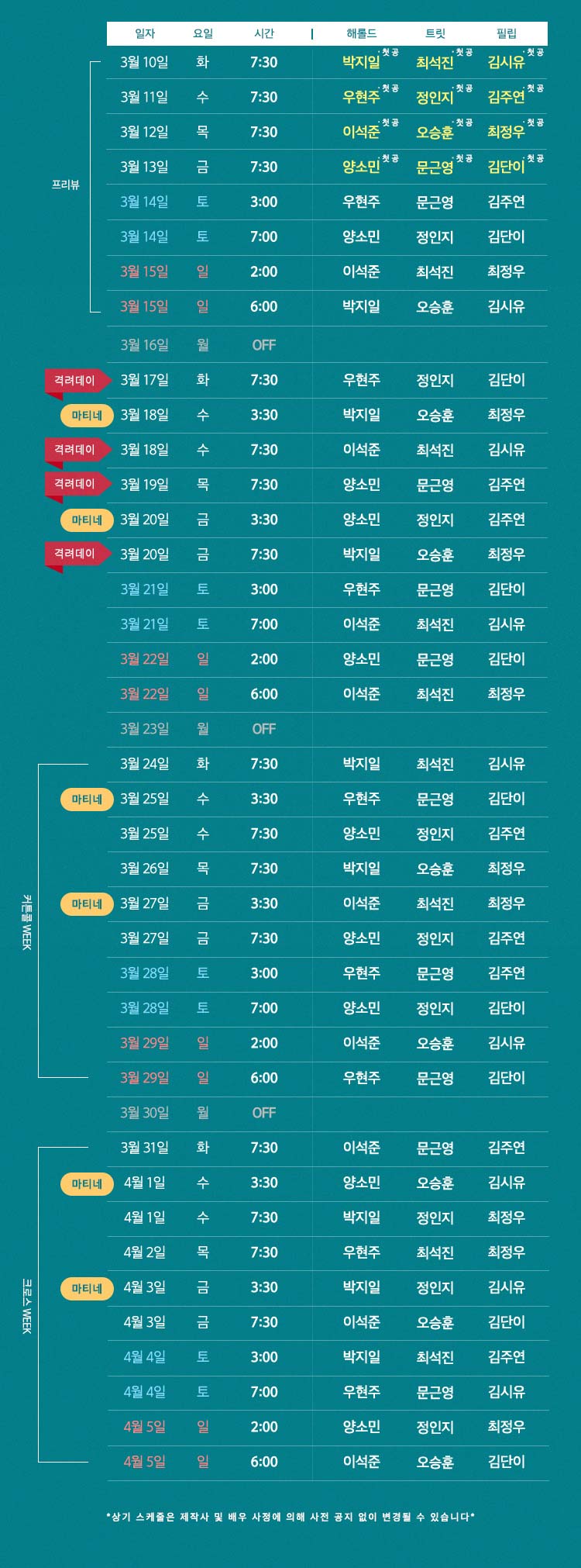[화,목] 7시 30분 [수,금] 3시 30분, 7시 30분 [토] 3시, 7시 [일&공휴일] 2시, 6시