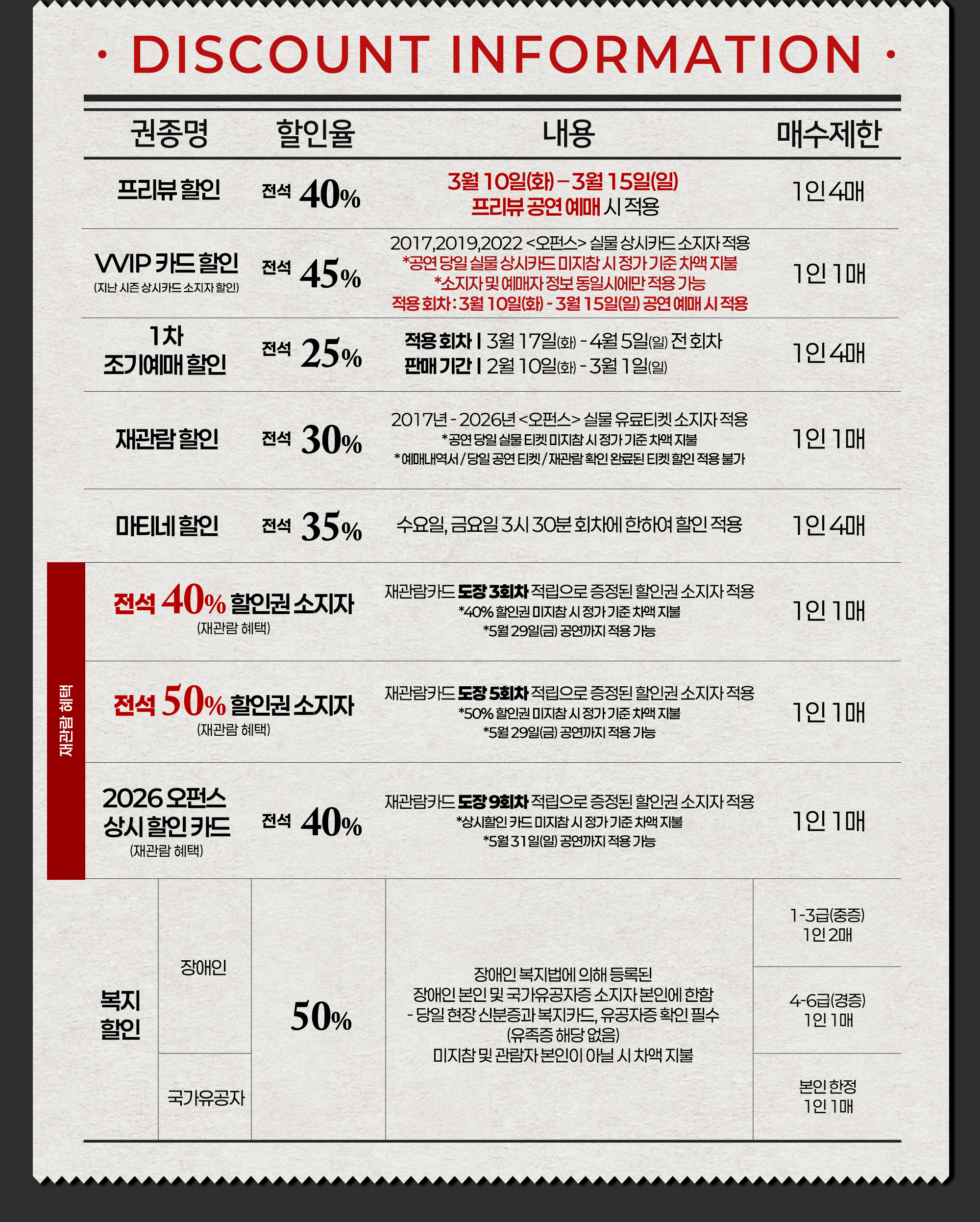 - 특정 기간, 특정 공연일에만 판매하는 가격이 있으니 예매 전 [가격 전체 보기]를 눌러 확인해 주세요.