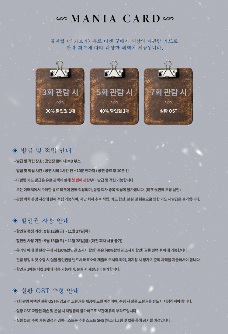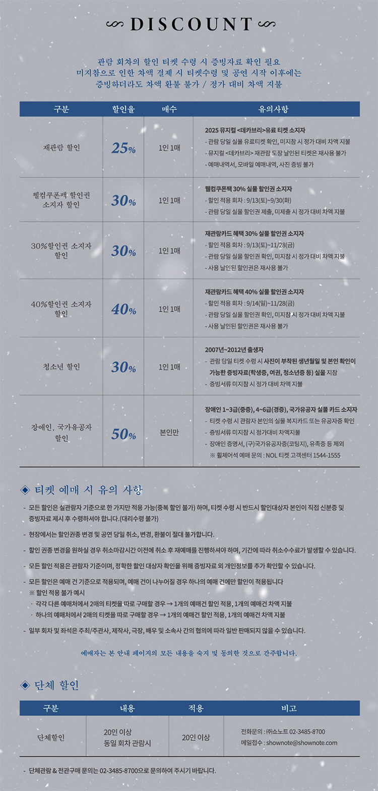 - 관람일 2일전 ~ 취소기한까지: 티켓금액의 30%