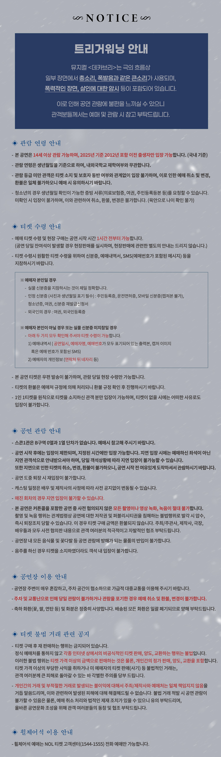 - 예매 후 7일 이내 취소시 티켓 금액 전액이 환불됩니다.(예매 수수료 제외)