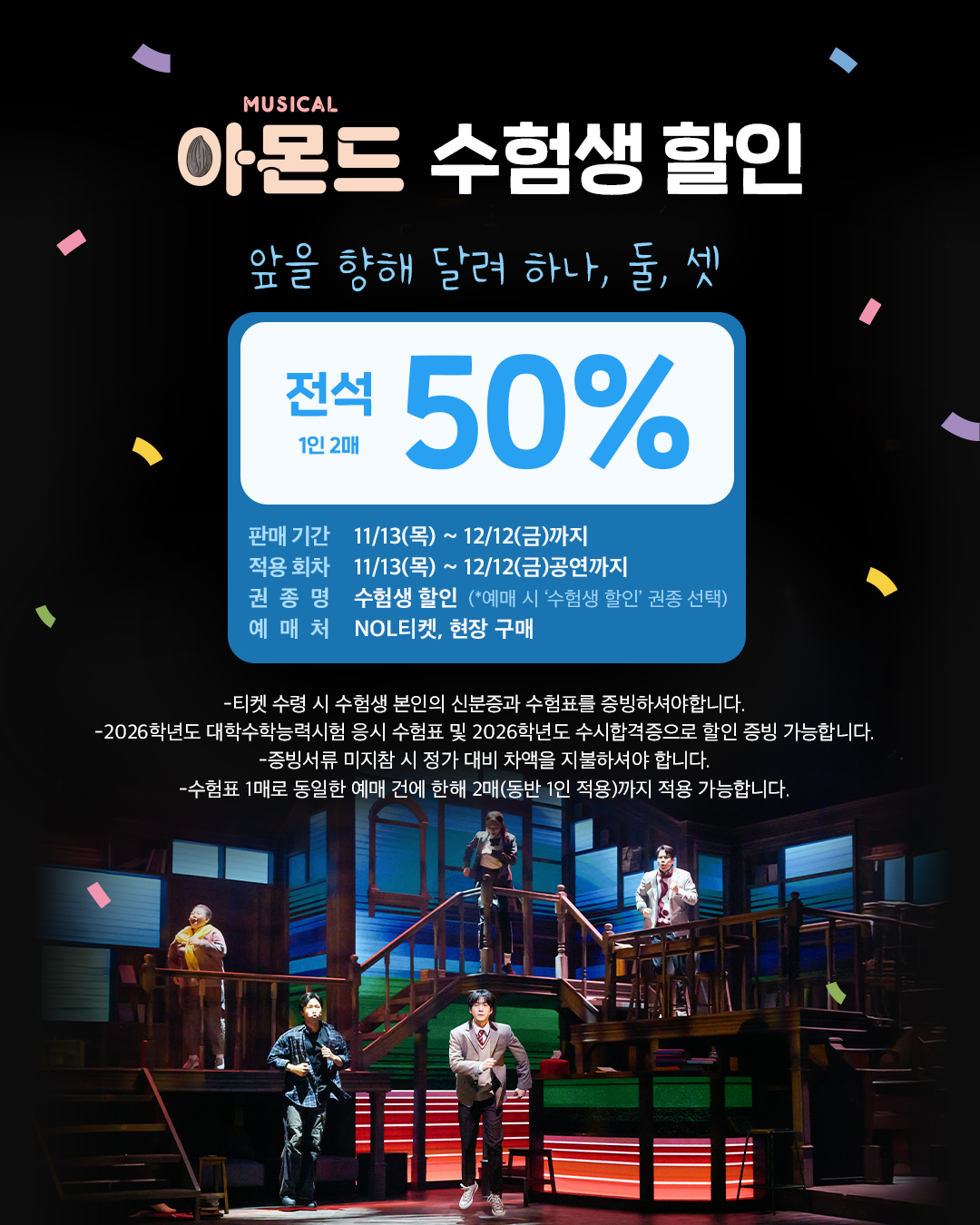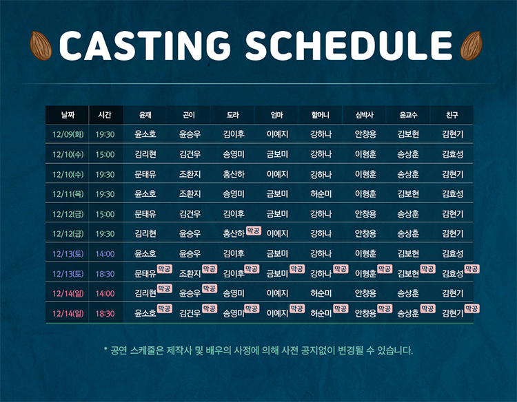 화,목,금 19:30 / 수 15:00, 19:30 / 주말 및 공휴일 14:00, 18:30 (월 공연 없음)