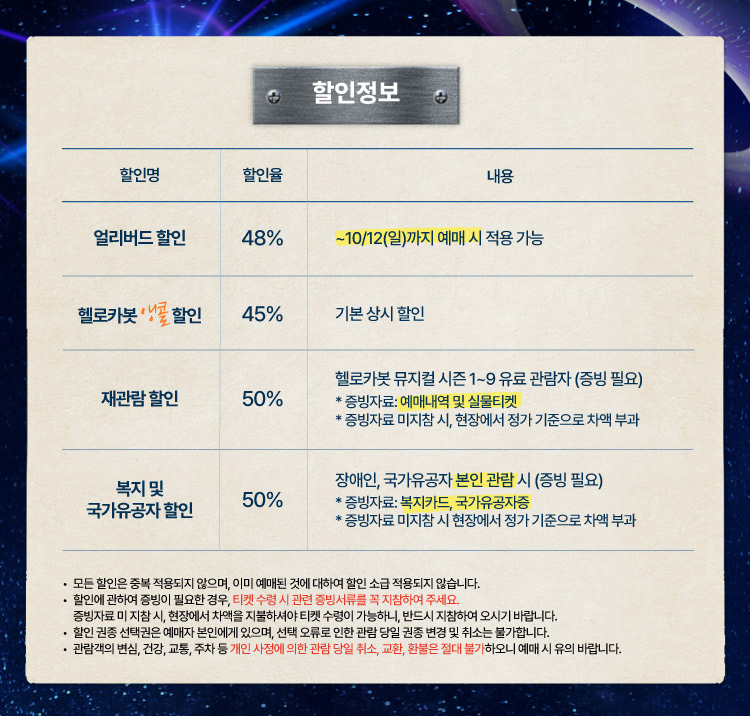 - 예매 후 7일 이내 취소시 티켓 금액 전액이 환불됩니다.(예매 수수료 제외)