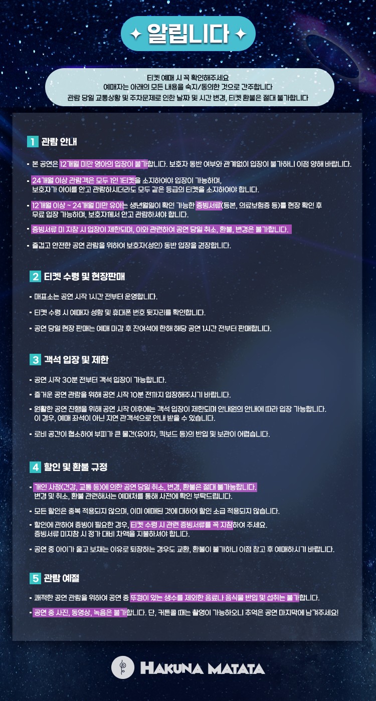 - 관람일 2일전 ~ 취소기한까지: 티켓금액의 30%