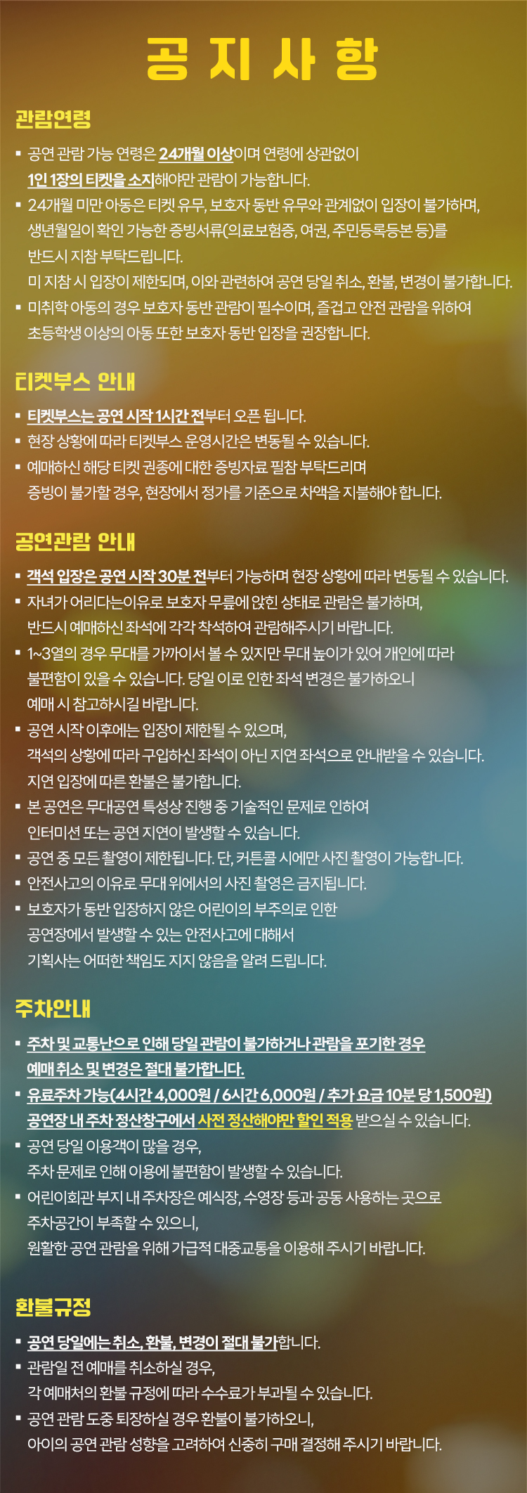 화, 수, 목, 금 11시, 14시 │ 토, 일, 공휴일 11시, 14시 , 16시 30분│ 월 공연 없음