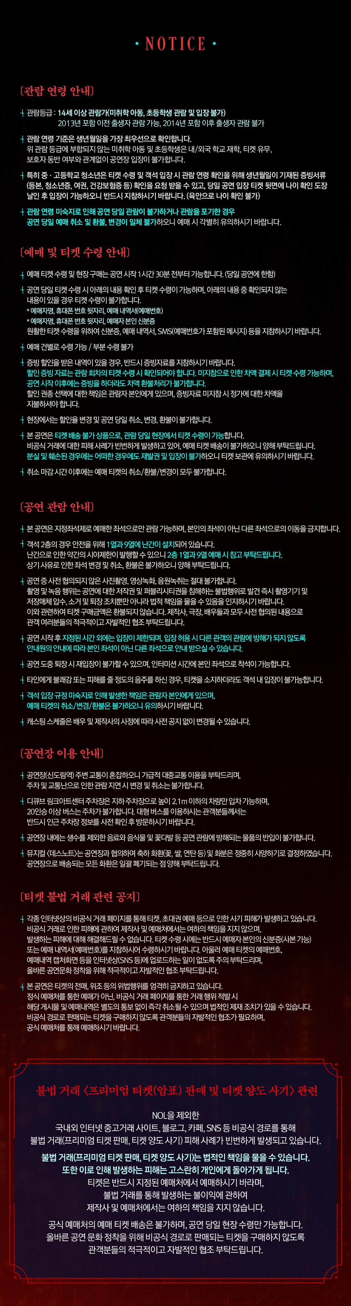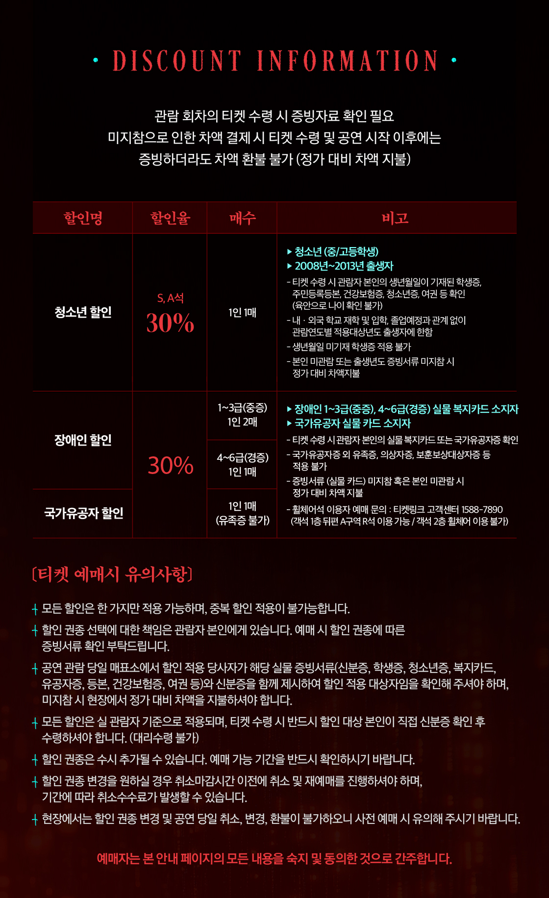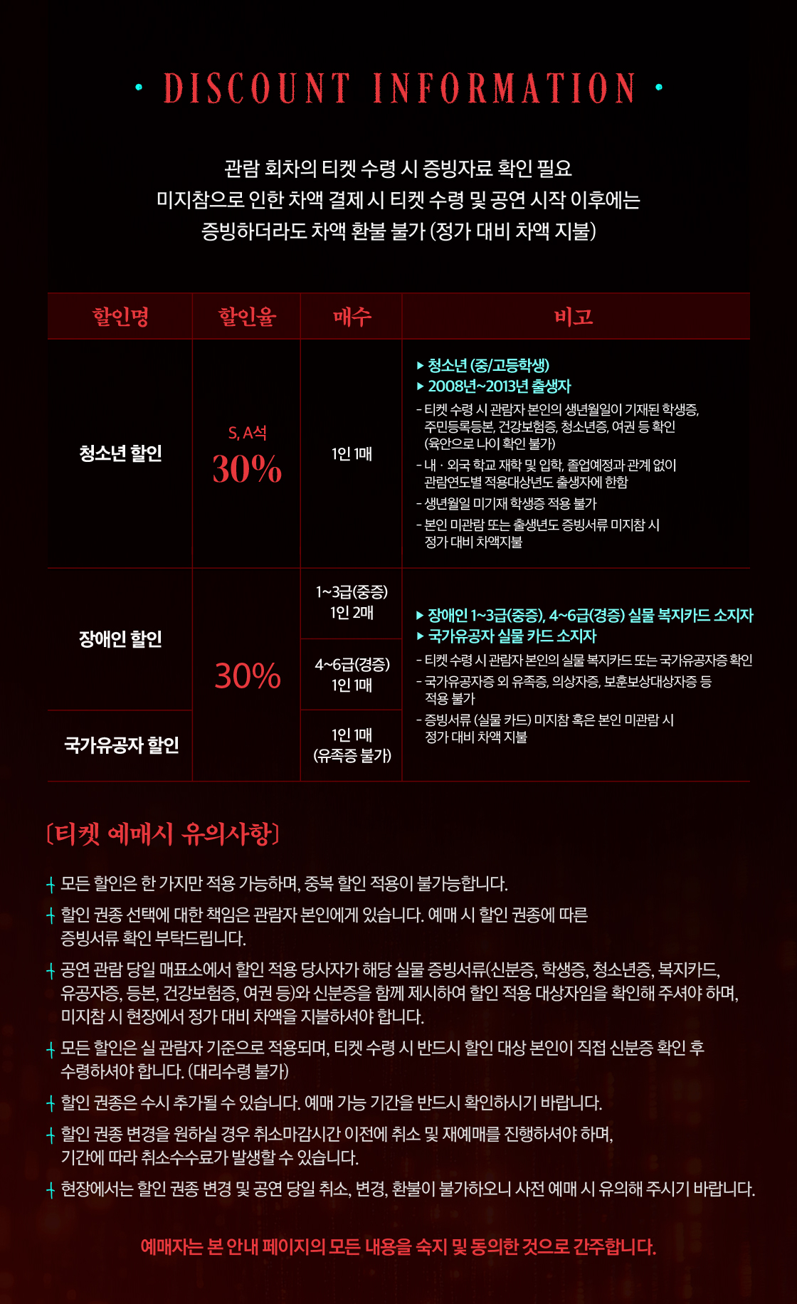 - 관람일 2일전 ~ 취소기한까지: 티켓금액의 30%