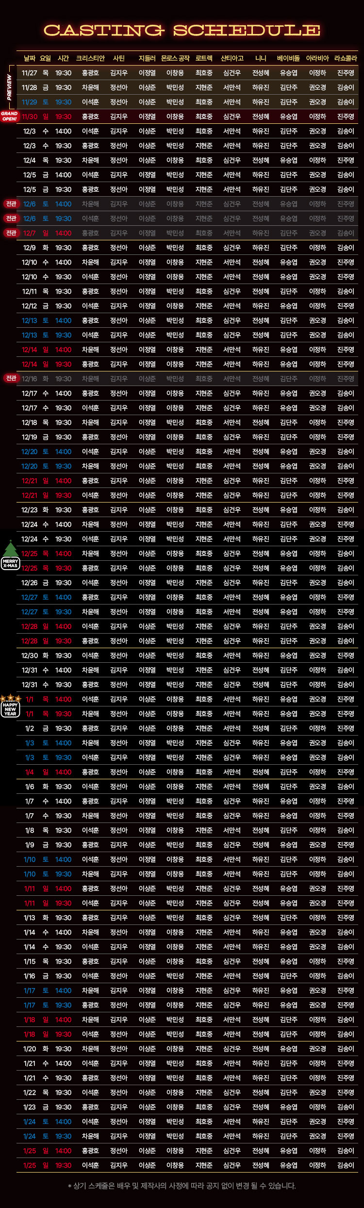 ※ 12/3(수), 12/5(금), 12/10(수), 12/17(수), 12/24(수), 12/25(목), 12/31(수), 1/1(목) 오후 2시, 오후 7시 30분 │ 2회 공연
