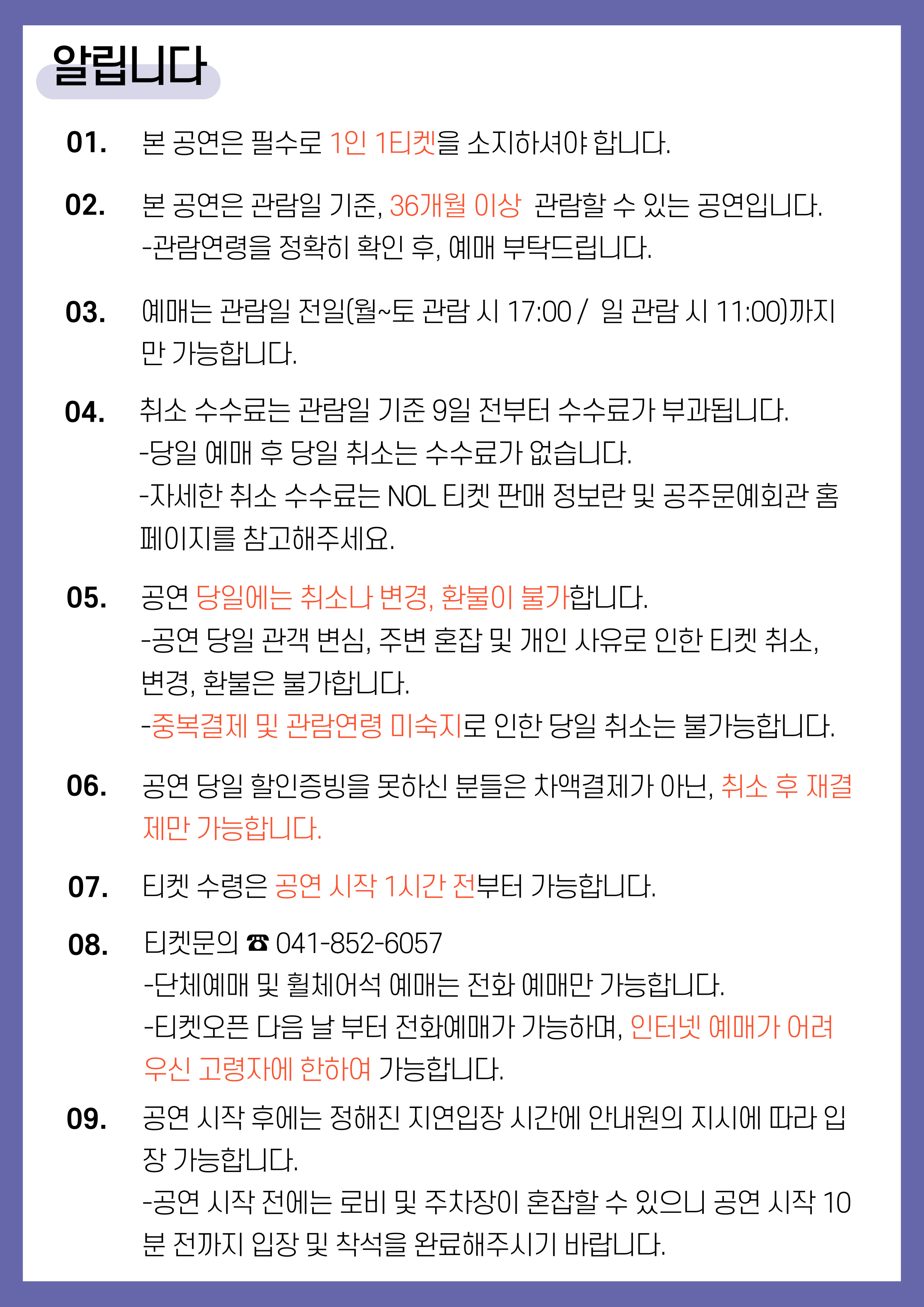 - 관람일 2일전 ~ 취소기한까지: 티켓금액의 30%
