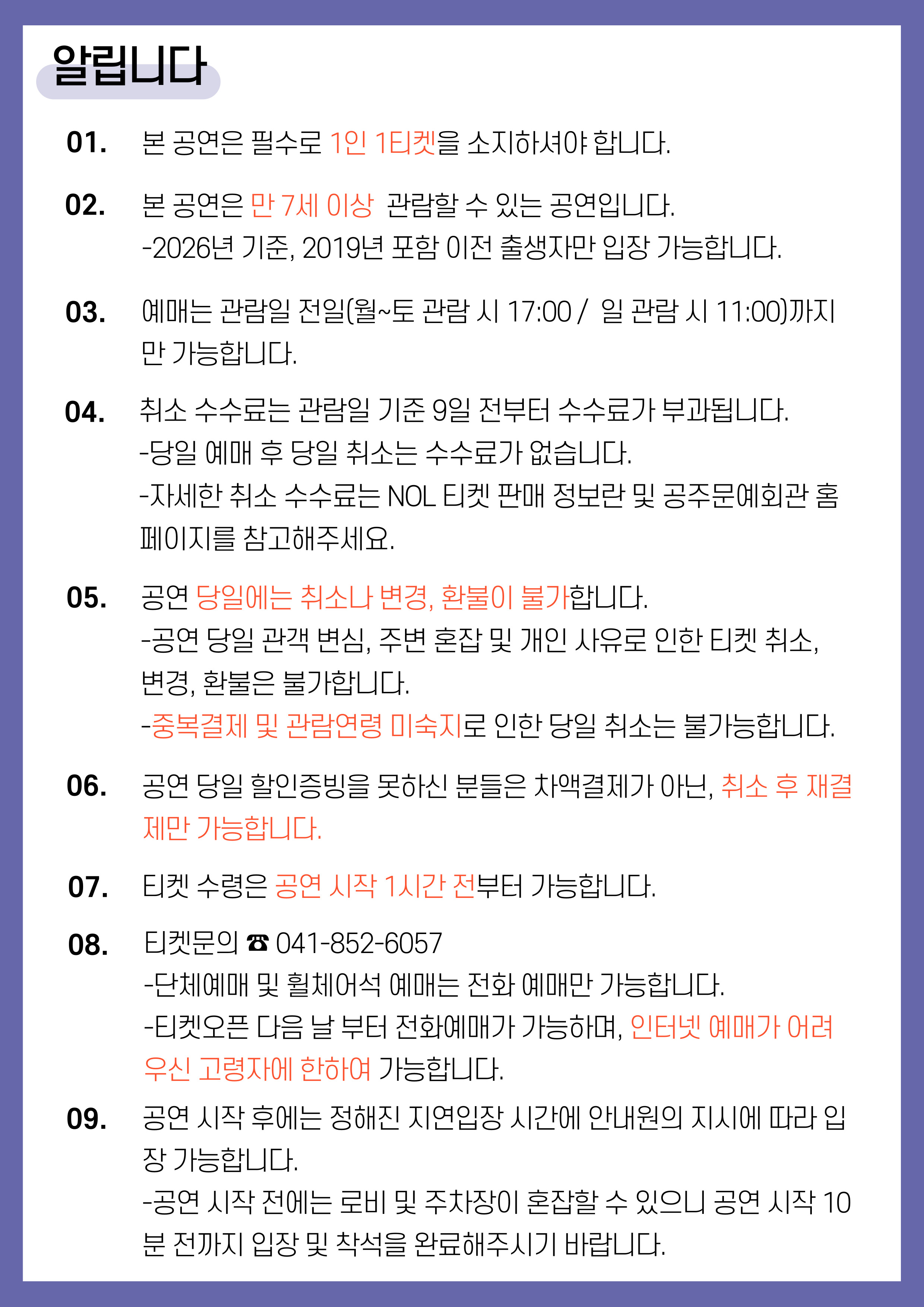 - 예매 후 7일 이내 취소시 티켓 금액 전액이 환불됩니다.(예매 수수료 제외)