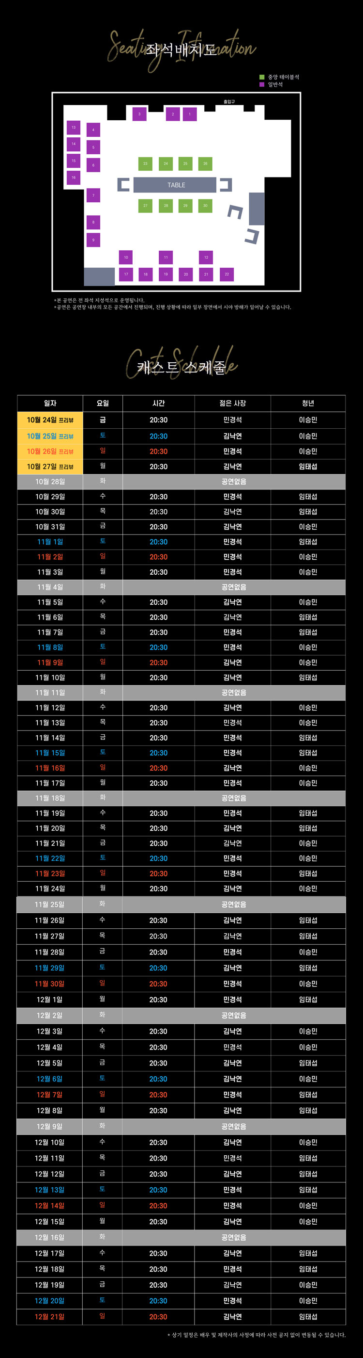 월,수,목,금,토,일 오후 20시30분 (화요일 공연 없음)