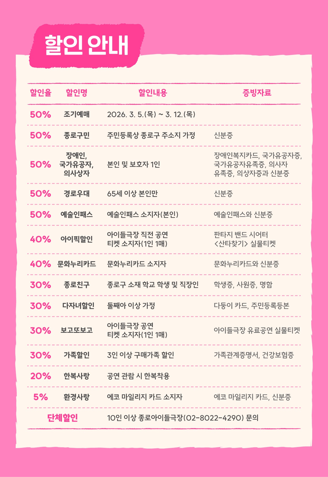 - 예매 8일 이후~관람일 10일전까지: 장당 4,000원(티켓 금액의 10% 이내)