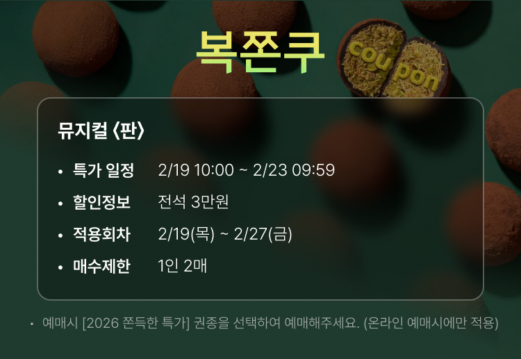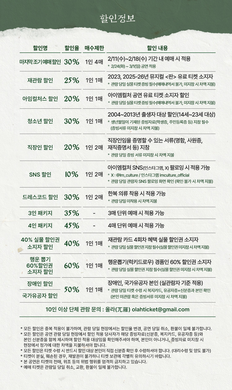 - 특정 기간, 특정 공연일에만 판매하는 가격이 있으니 예매 전 [가격 전체 보기]를 눌러 확인해 주세요.