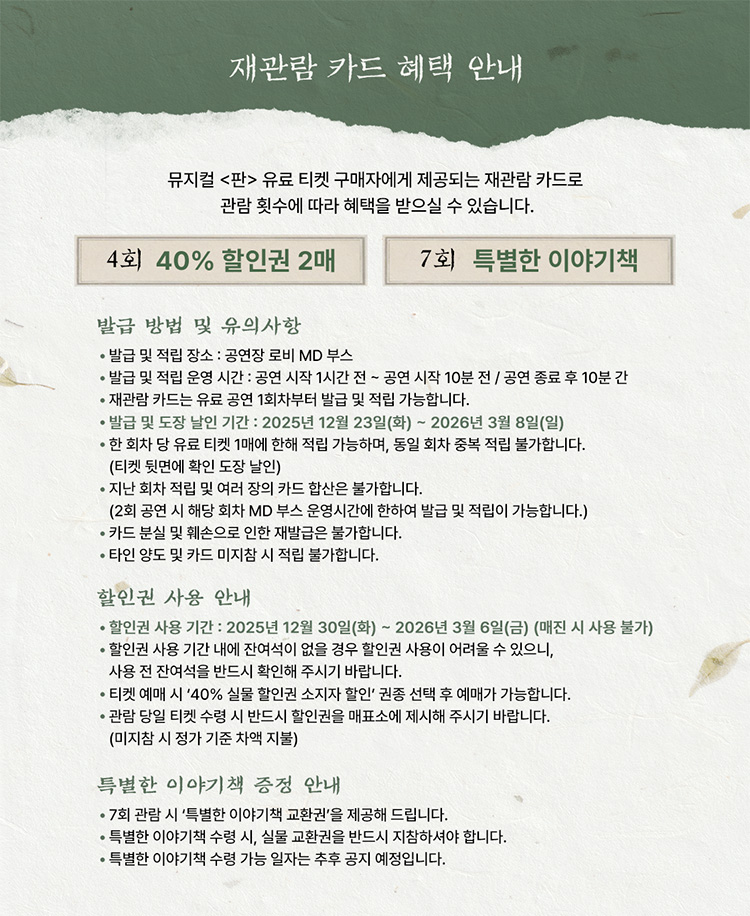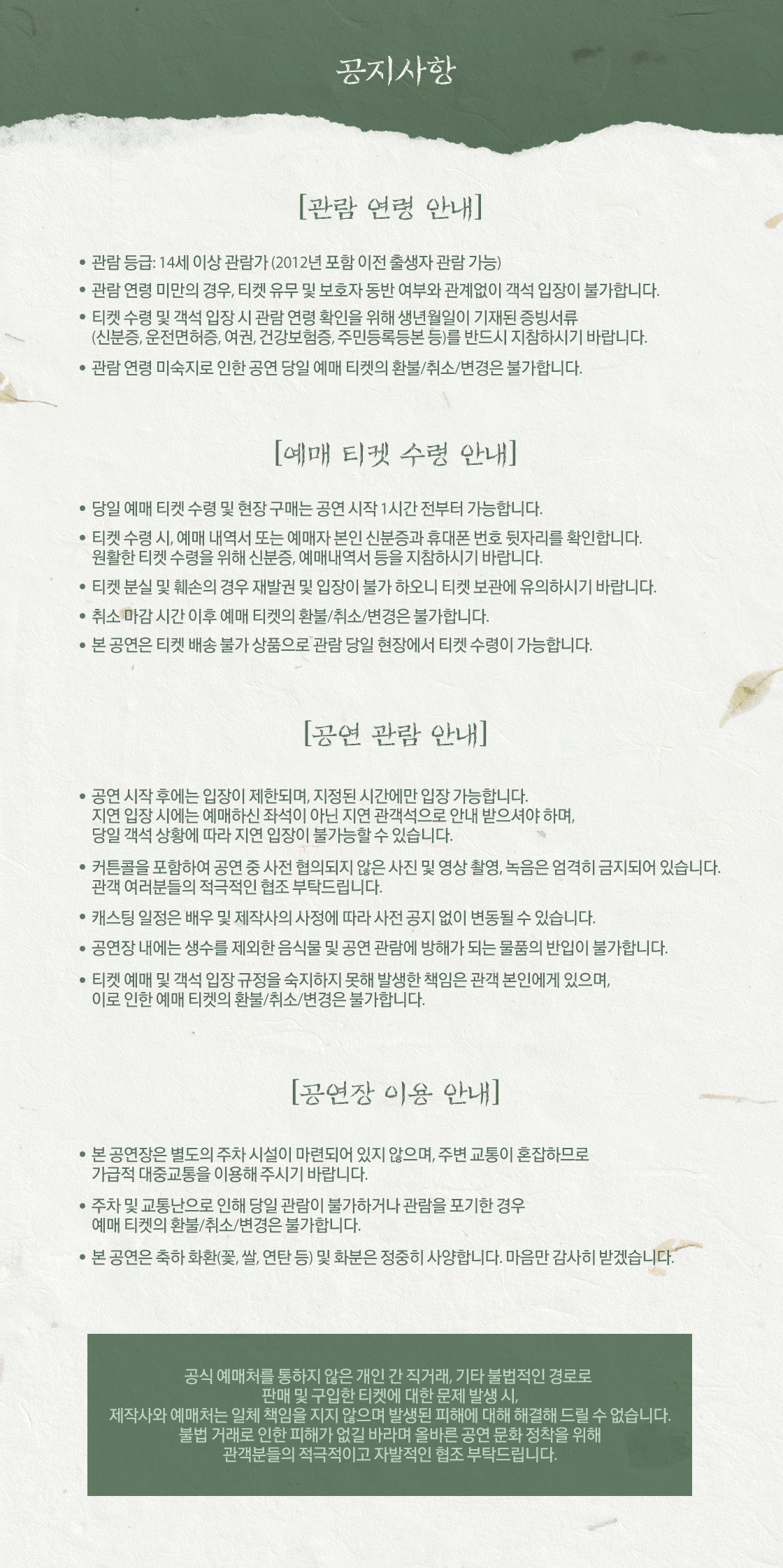 - 관람일 2일전 ~ 취소기한까지: 티켓금액의 30%