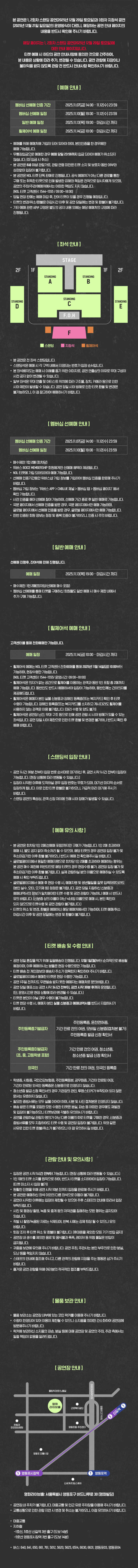 ※본 공연은 1, 2회차 스탠딩 공연(2025년 12월 20일 토요일)과 3회차 지정석 공연(2025년 12월 21일 일요일)의 운영방식이 다르니, 해당하는 공연 안내 페이지의 내용을 반드시 확인해 주시기 바랍니다.