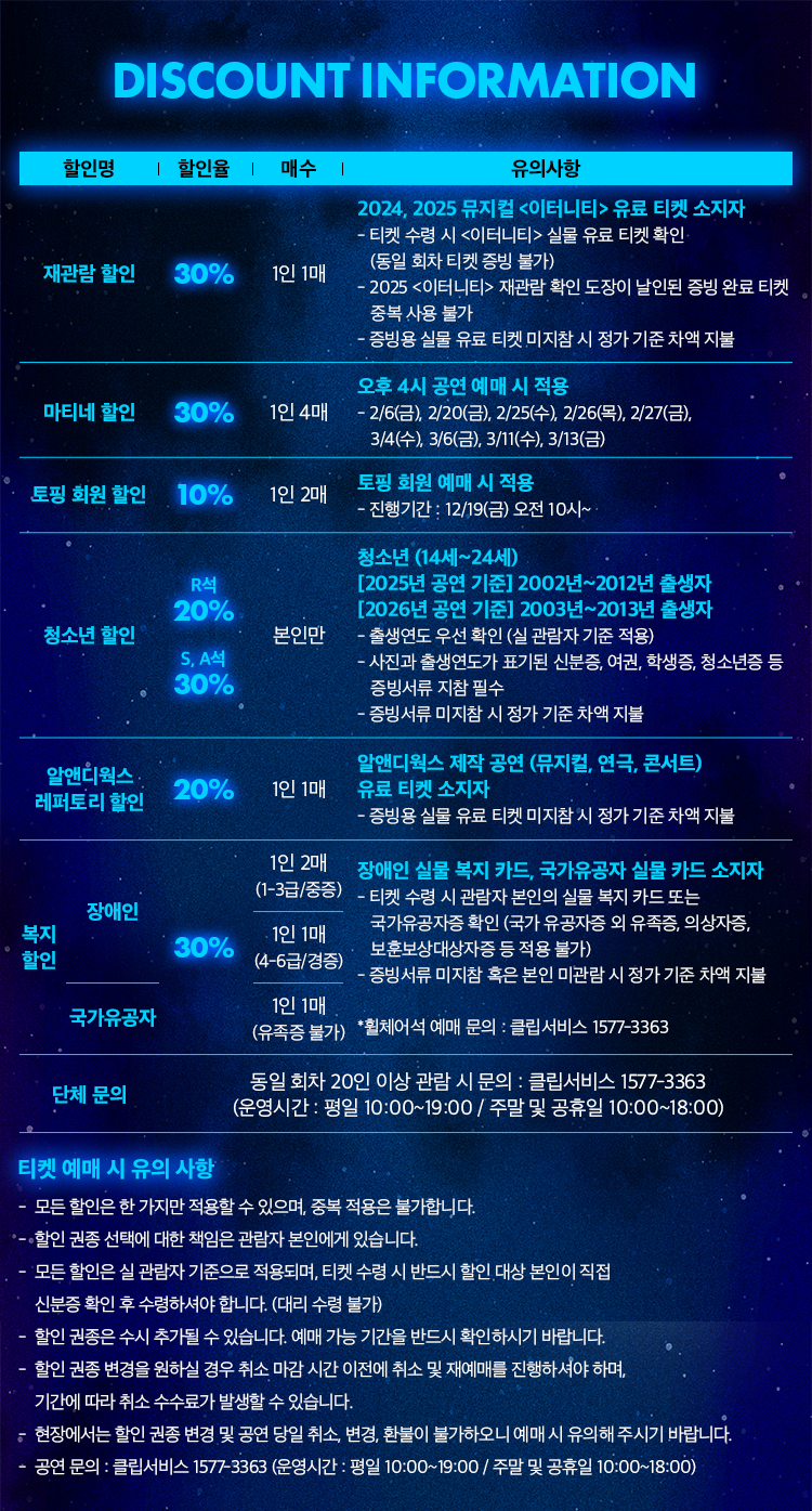 화, 수, 목, 금 오후 8시 | 토, 일, 공휴일 오후 2시, 6시 (월 공연 없음)