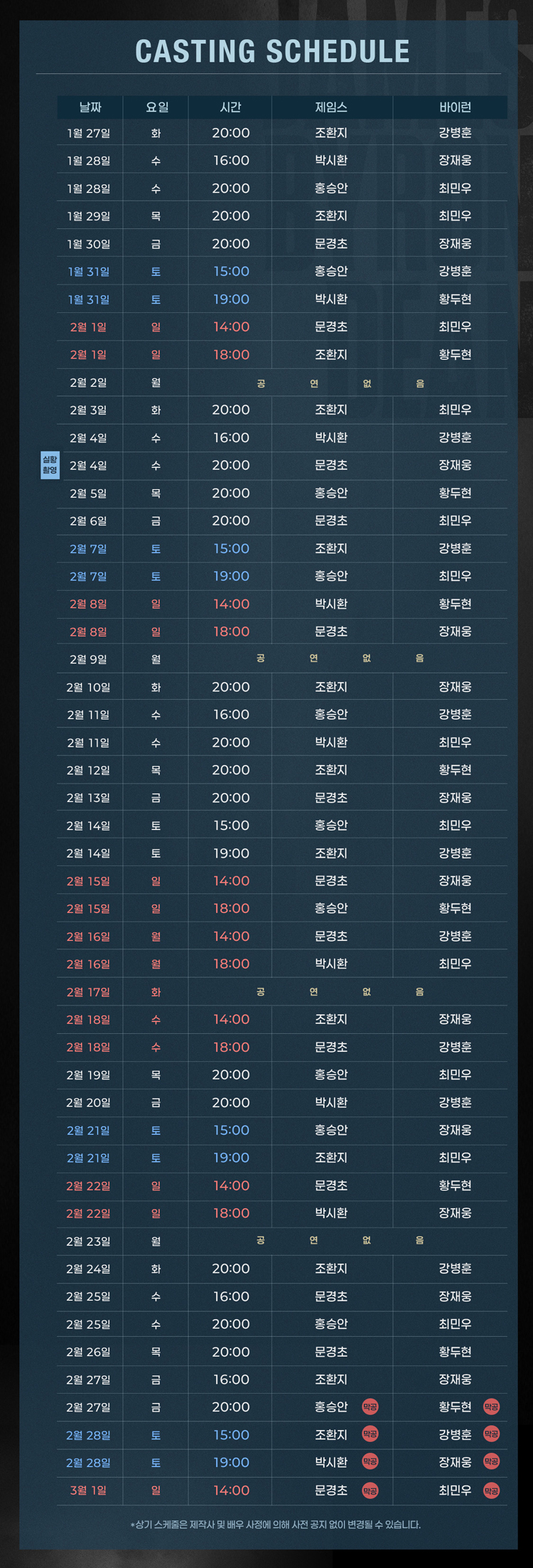 화,목,금 8시 | 수 4시, 8시 | 토 3시, 7시 | 일 및 공휴일 2시, 6시 (월 공연 없음)