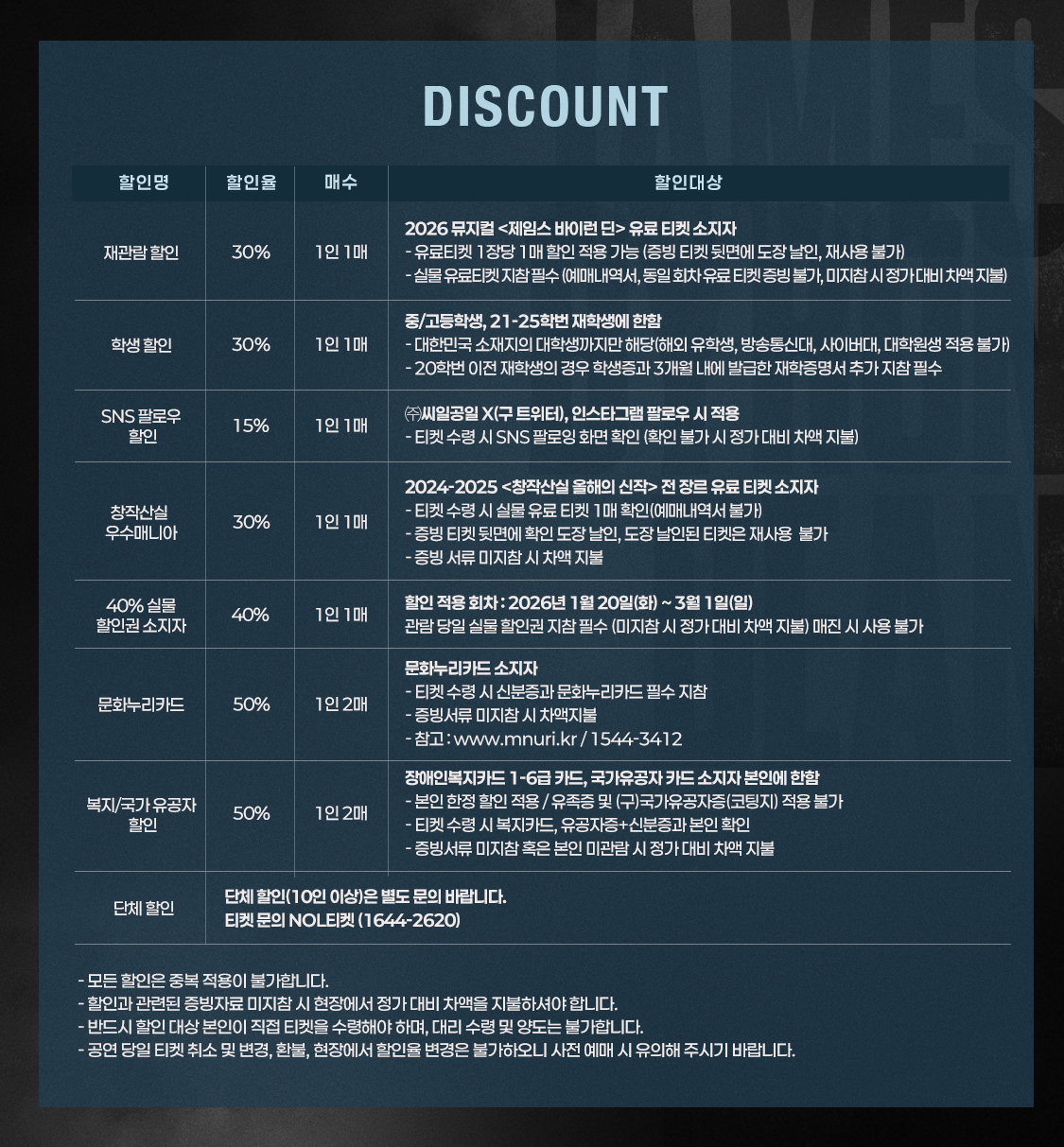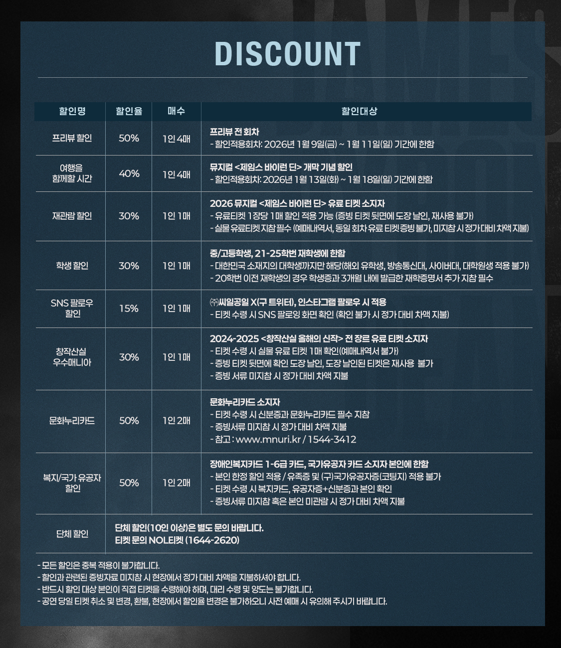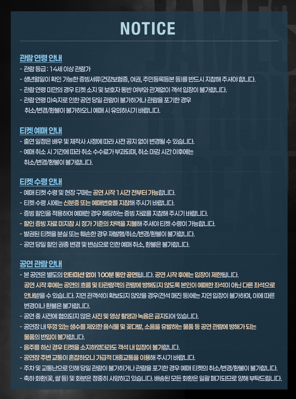 - 관람일 2일전 ~ 취소기한까지: 티켓금액의 30%