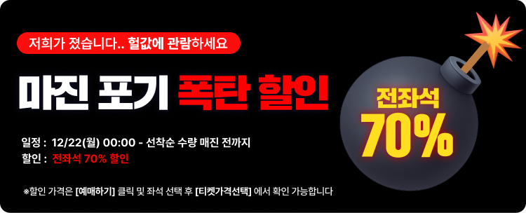 - 예매 당일 자정(밤 12시) 이전 취소시 티켓 취소수수료가 없으며, 예매 수수료도 환불됩니다.(취소기한 내 한함)