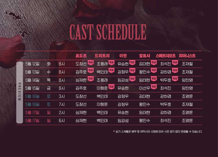 화, 목, 금 8시 | 수 4시, 8시 | 토 3시, 7시 | 일 2시, 6시
