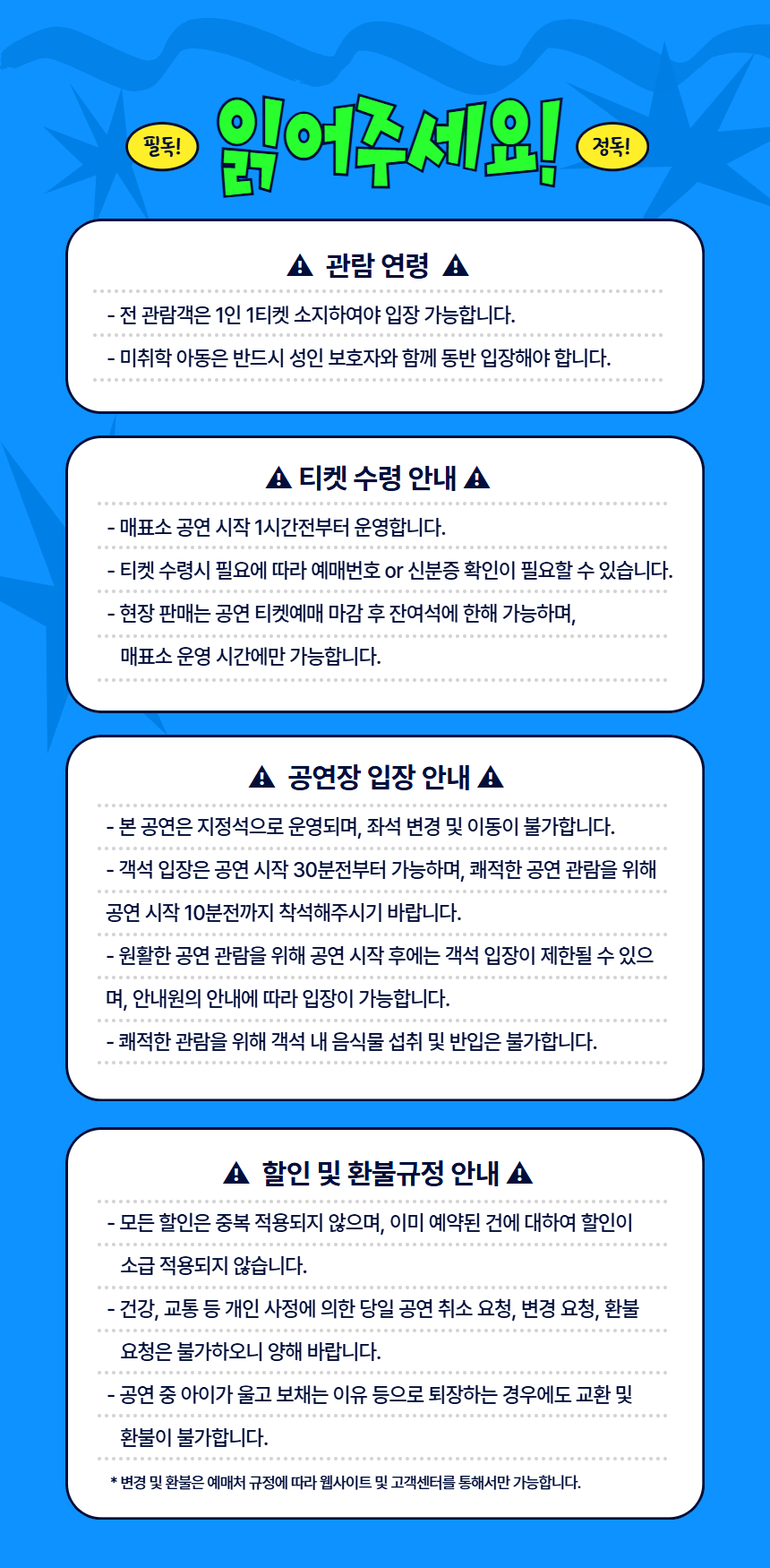 - 예매 당일 자정(밤 12시) 이전 취소시 티켓 취소수수료가 없으며, 예매 수수료도 환불됩니다.(취소기한 내 한함)