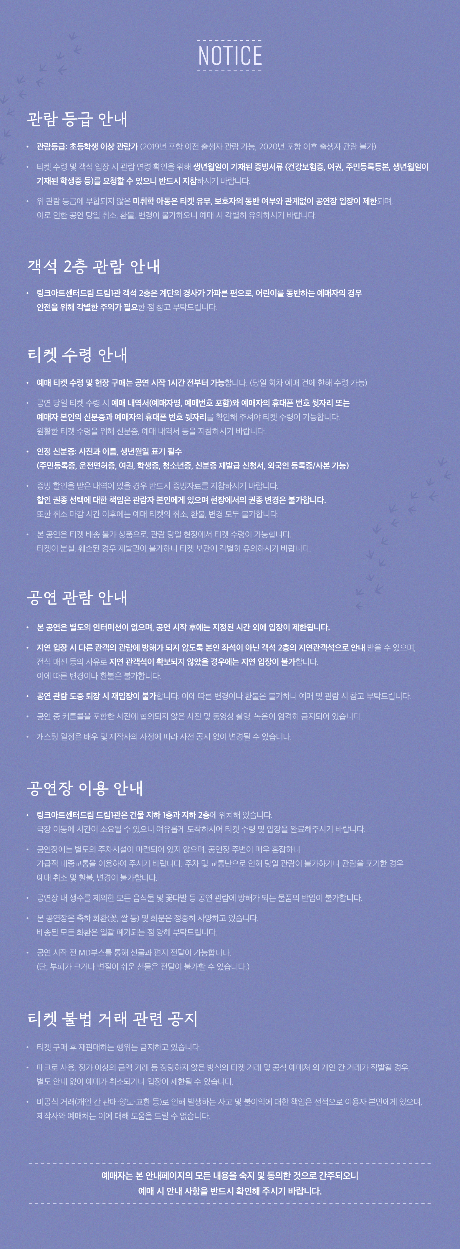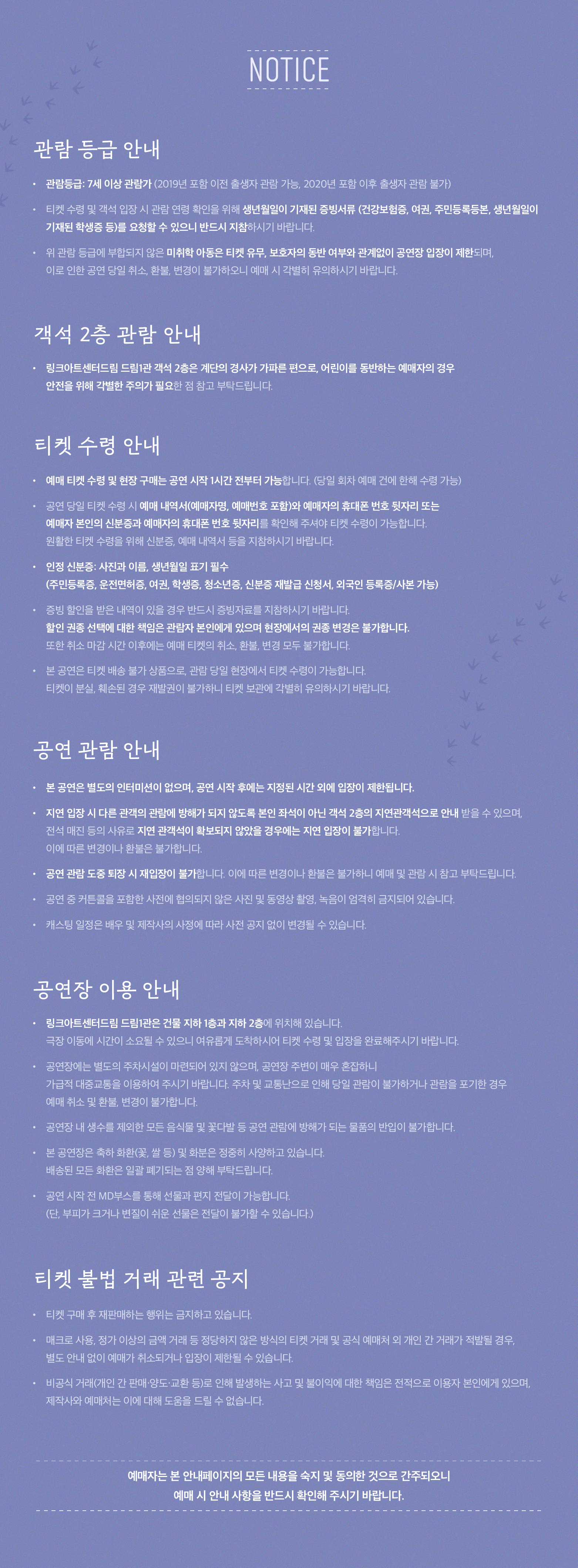 - 관람일 2일전 ~ 취소기한까지: 티켓금액의 30%