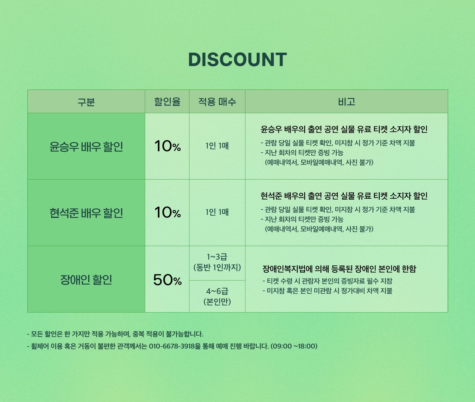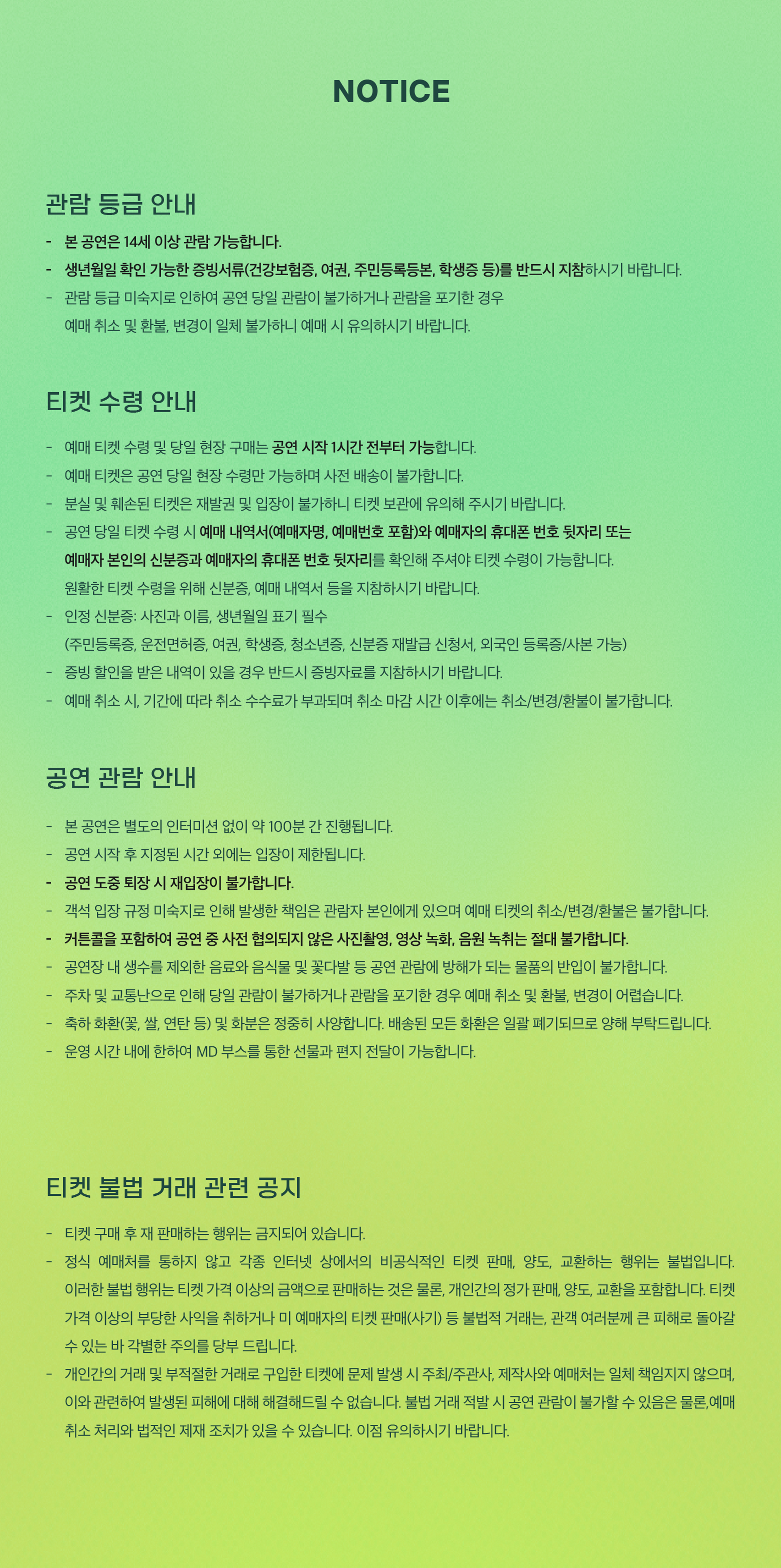 - 특정 기간, 특정 공연일에만 판매하는 가격이 있으니 예매 전 [가격 전체 보기]를 눌러 확인해 주세요.