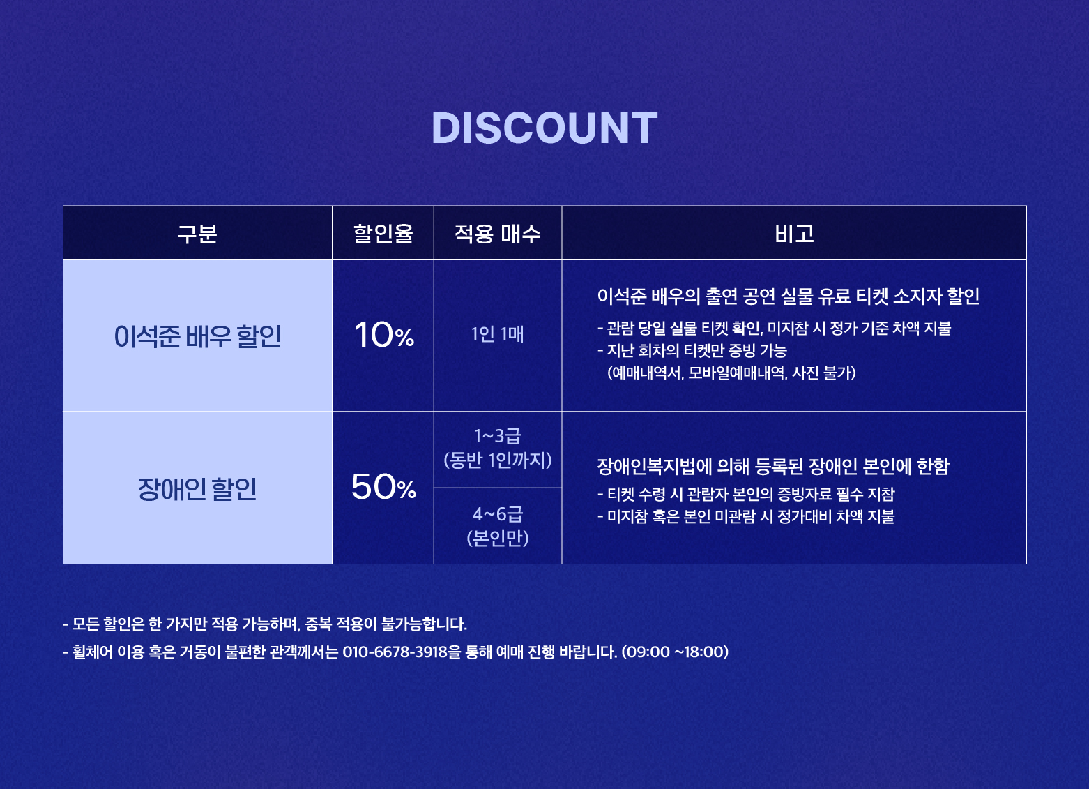 월~토요일 관람시: 전일 17시까지 / 일요일 관람시: 전일 11시까지