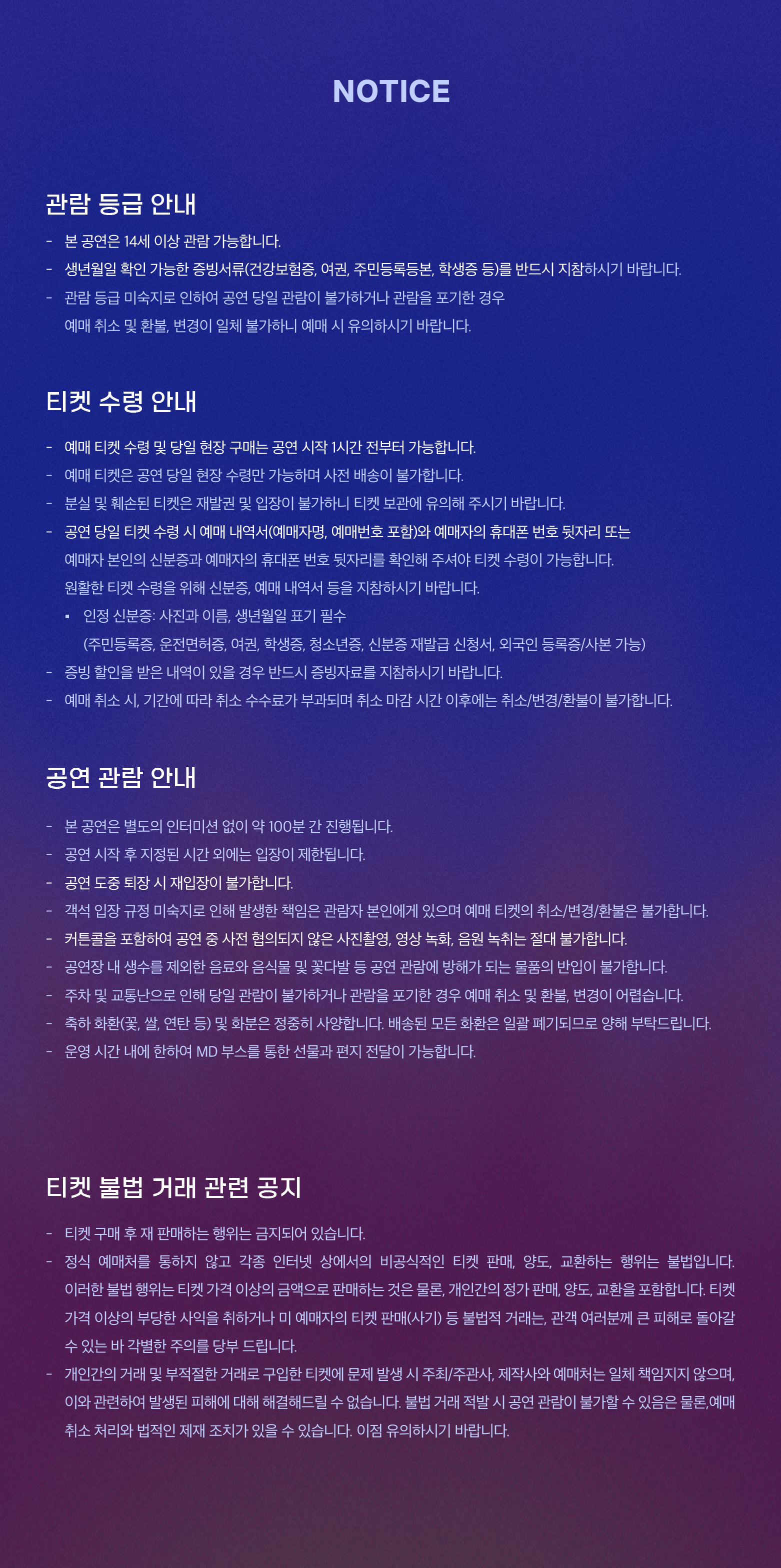 - 관람일 2일전 ~ 취소기한까지: 티켓금액의 30%