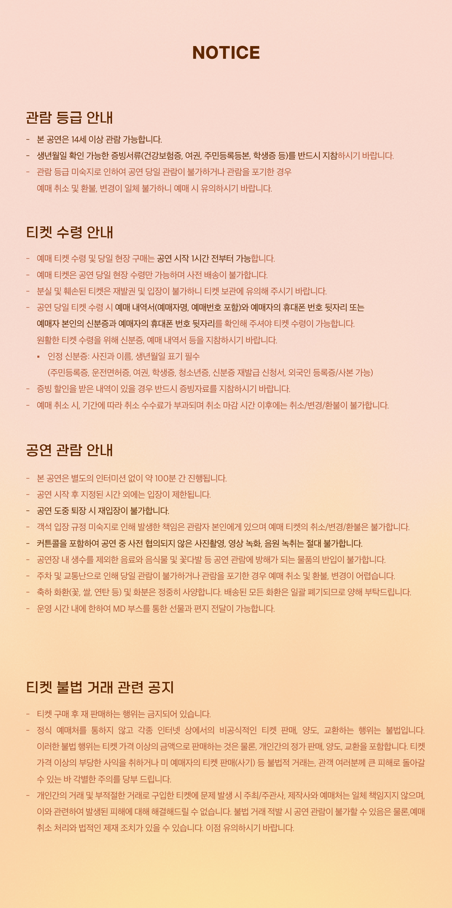 - 관람일 2일전 ~ 취소기한까지: 티켓금액의 30%